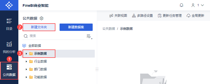 管理员登录FineBI系统,点击「公共数据」,添加文件夹「示例数据」。如下图所示:
