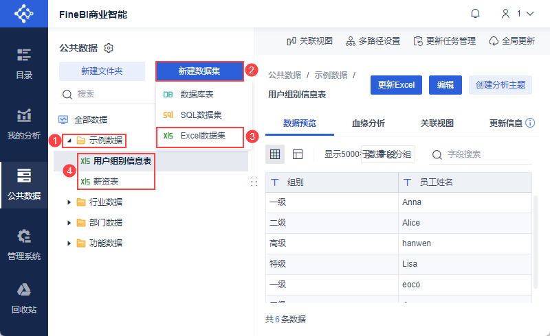 注:确保「用户组别信息表」中的用户都能够登录 FineBI 系统。