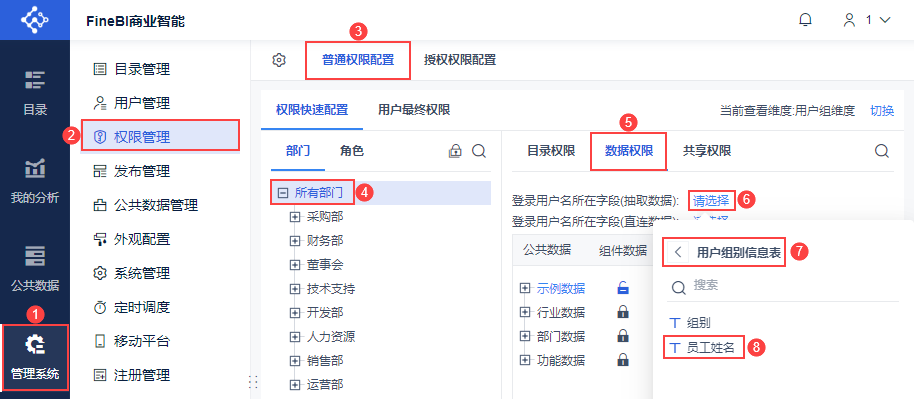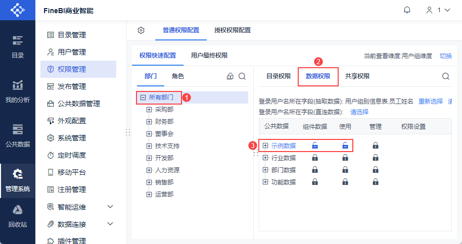 管理员登录数据决策系统,点击「管理系统>权限管理>普通权限配置」,选择权限载体为「所有部门」。