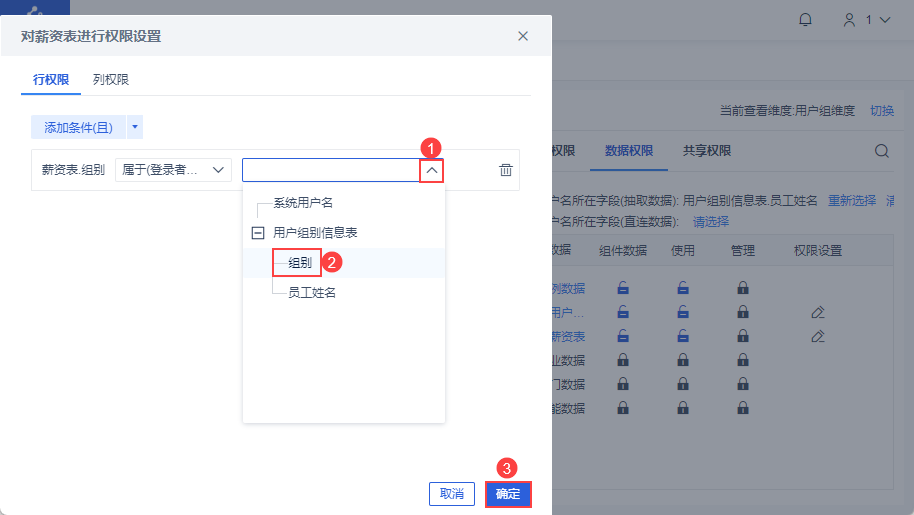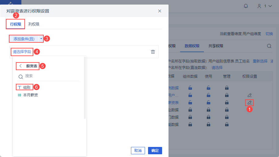 1)点击「薪资表」右侧的权限设置按钮,添加行权限过滤条件,选择「薪资表」下的「组别」字段,如下图所示: