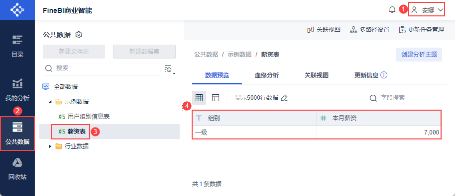 用户 Anna(Anna,1)登录 FineBI 系统,查看「薪资表」,只能看到自己的工资和组别。如下图所示: