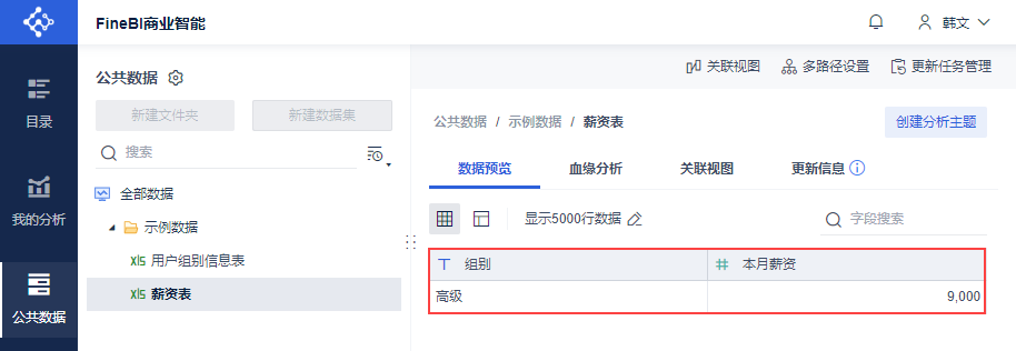 用户 hanwen(hanwen,1)登录 FineBI 系统,查看「薪资表」,只能看到自己的工资和组别。如下图所示: