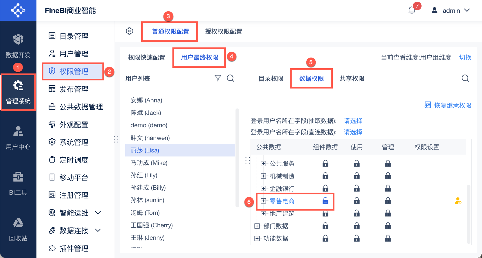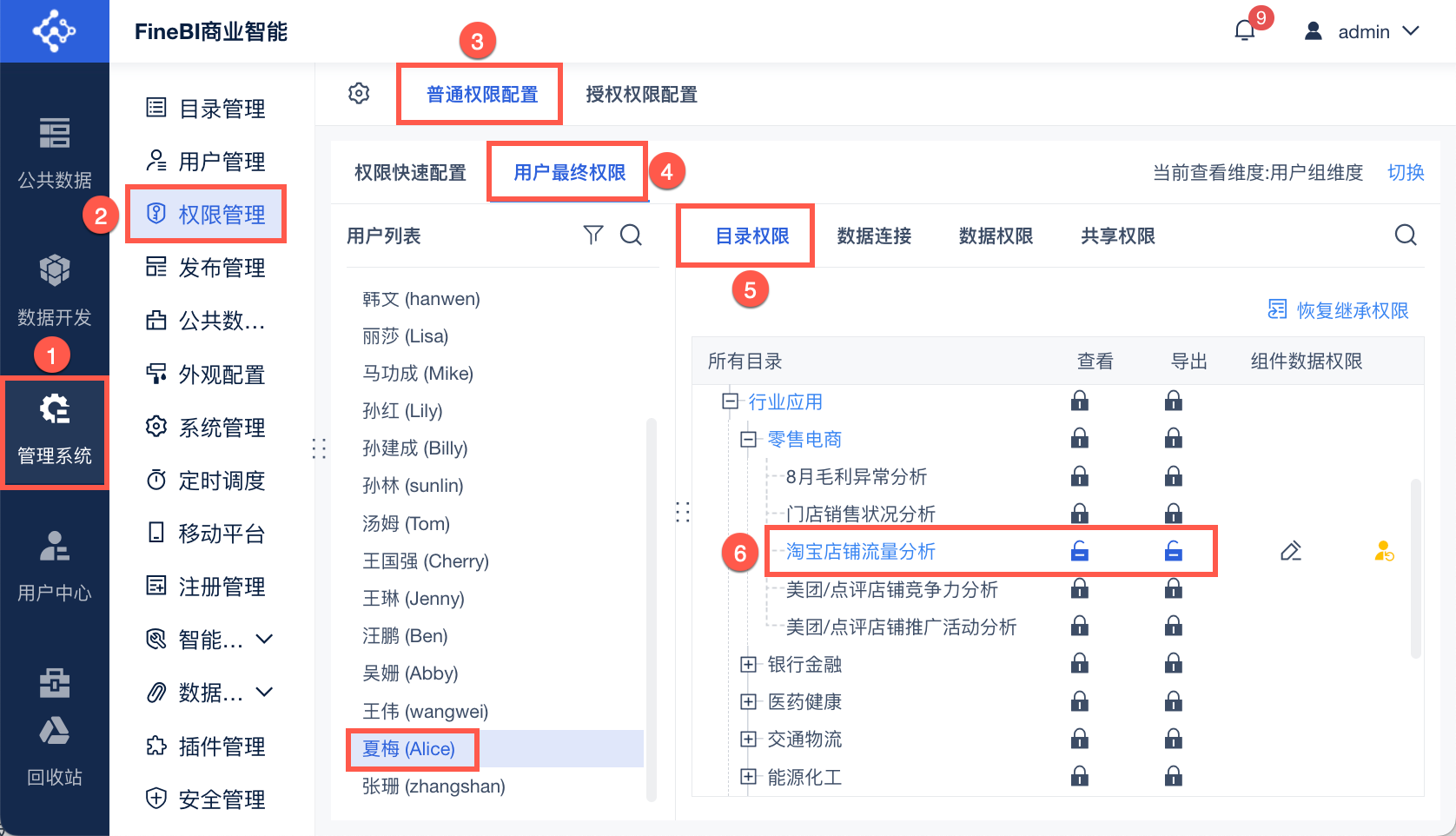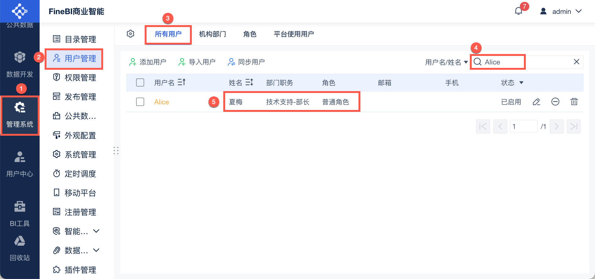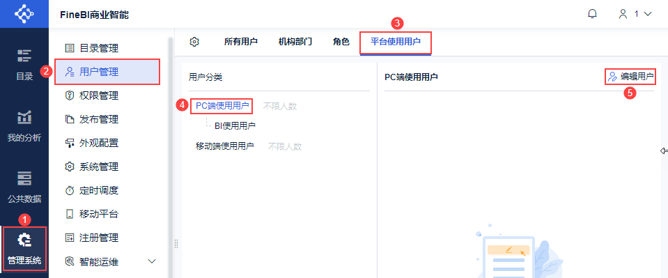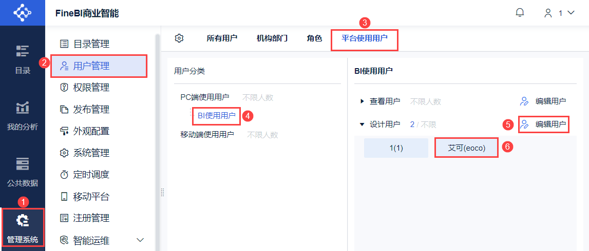 2)管理员进入管理系统>用户管理>PC端使用用户>平台使用用户,确认当前用户归类,需要确认首先将其添加至PC端使用用户,然后添加至 BI 使用用户下的查看用户或者设计用户中,详情参见:平台使用用户