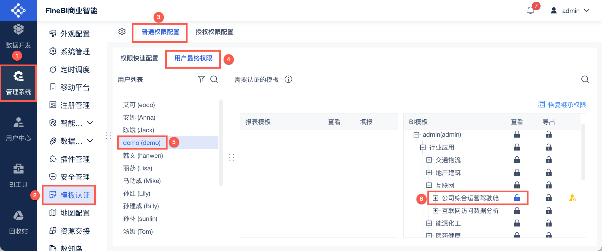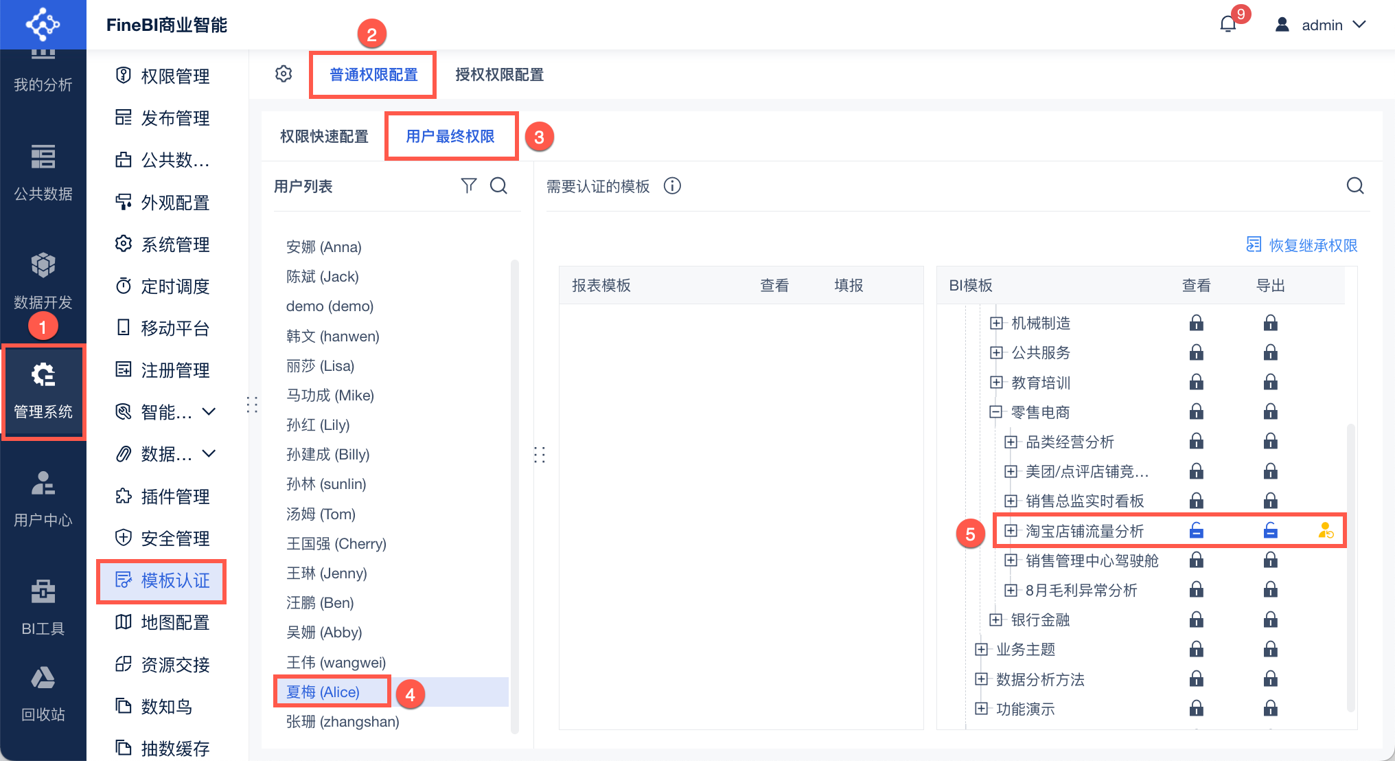 因此管理员需要给 Alice 开启模板认证对应 BI 模板的「导出」权限,如下图所示: