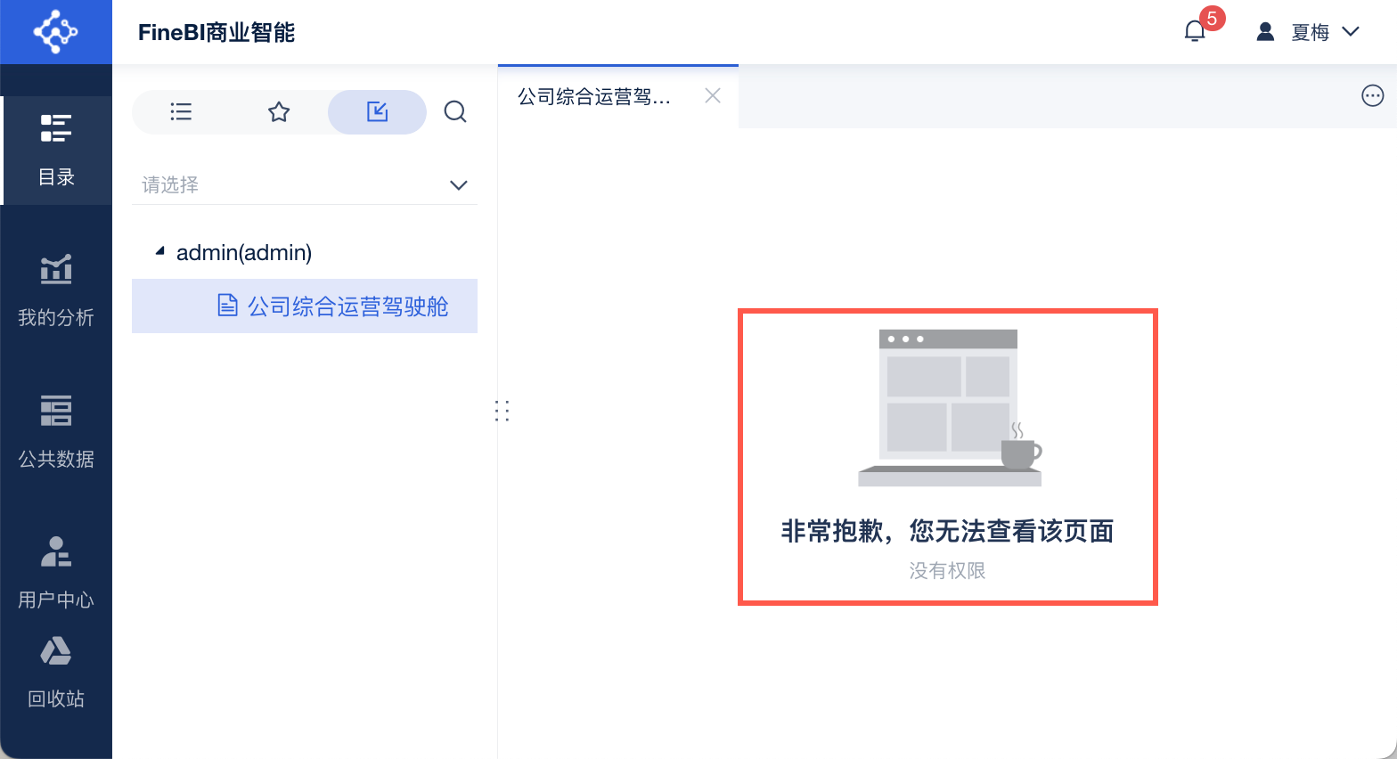 访问仪表板时,仪表板整体都报错:非常抱歉,您无法查看该页面,您没有该页面的访问权限,如需访问请联系管理员,如下图所示:
