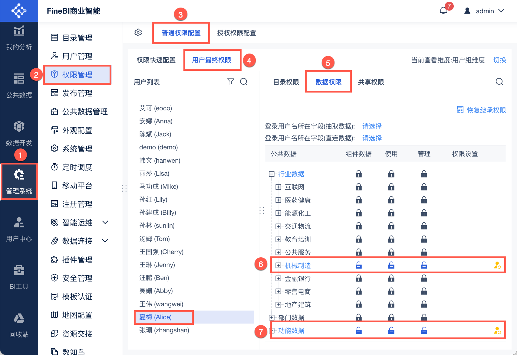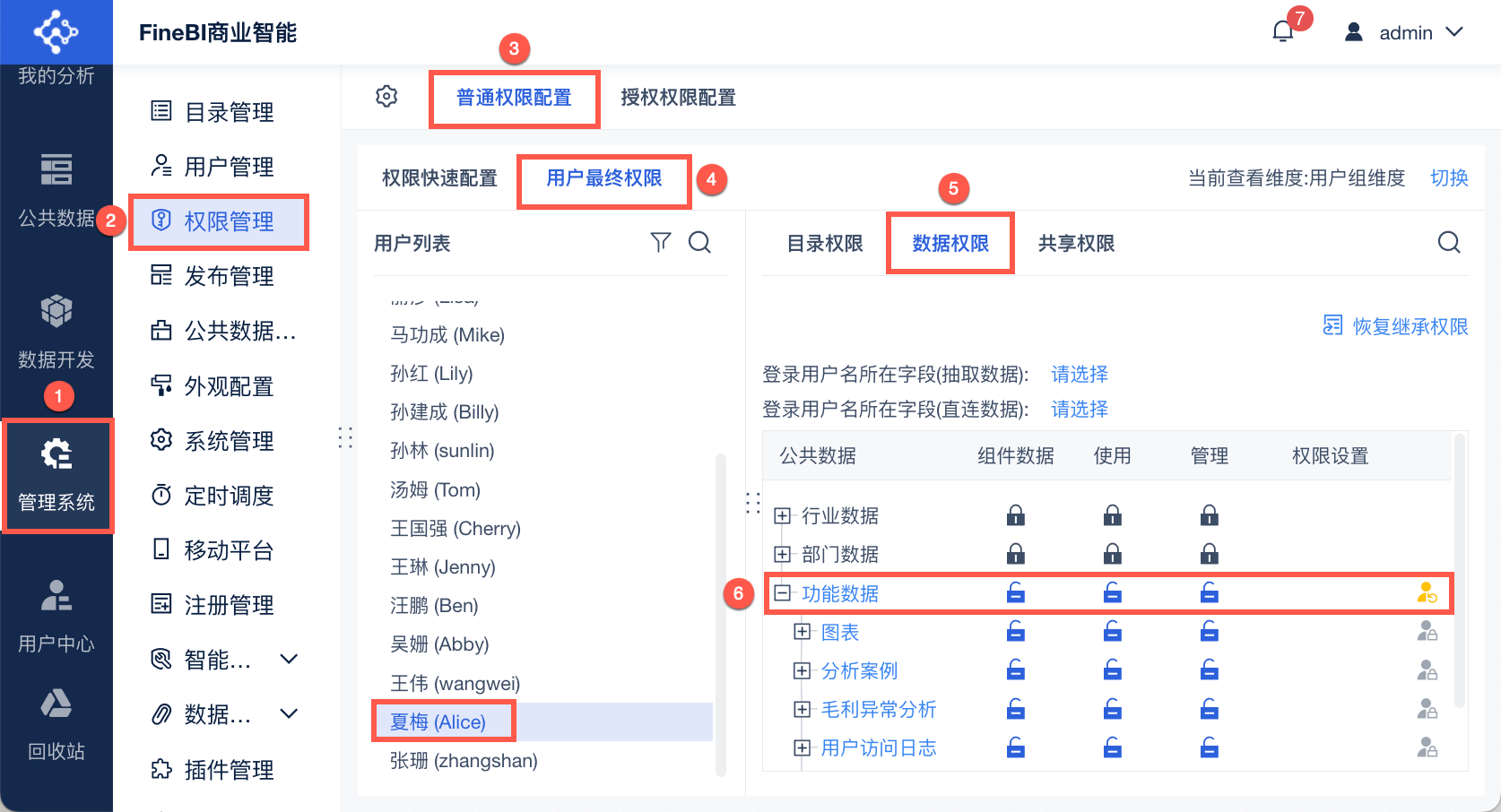 管理员必须为用户开启对应分组的管理权限,例如开启功能数据分组的管理权限,如下图所示: