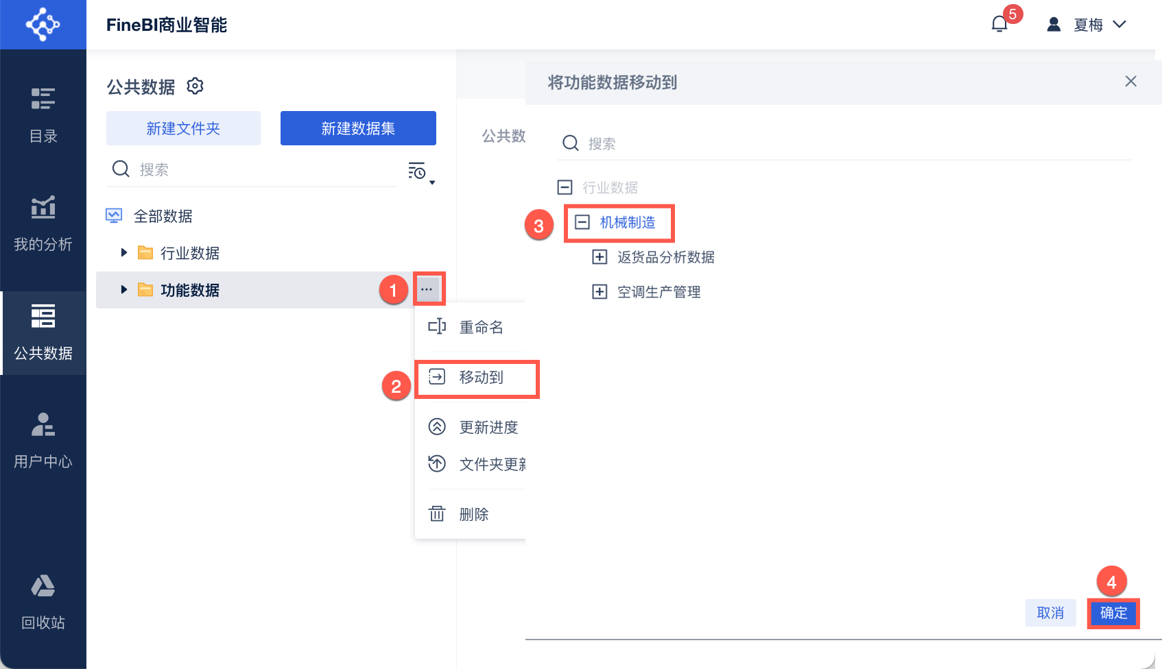 例如,用户 Alice 希望能将「功能数据」文件夹移动至「行业数据>机械制造」分组下,如下图所示: