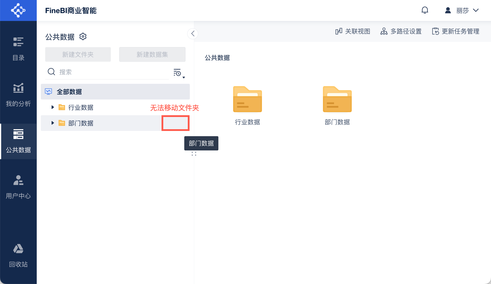 但用户无法将「功能数据」分组下的文件夹移动到「行业数据」分组下,因为用户没有「行业数据」分组的「管理」权限。