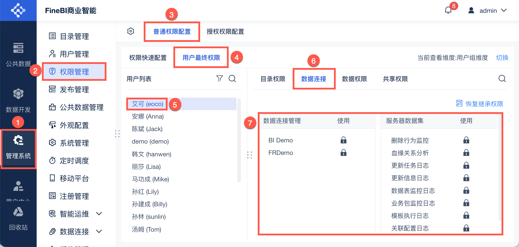 确认用户拥有添加对应数据库表和 数据集的数据连接权限,点击管理系统>权限管理,如下图所示: