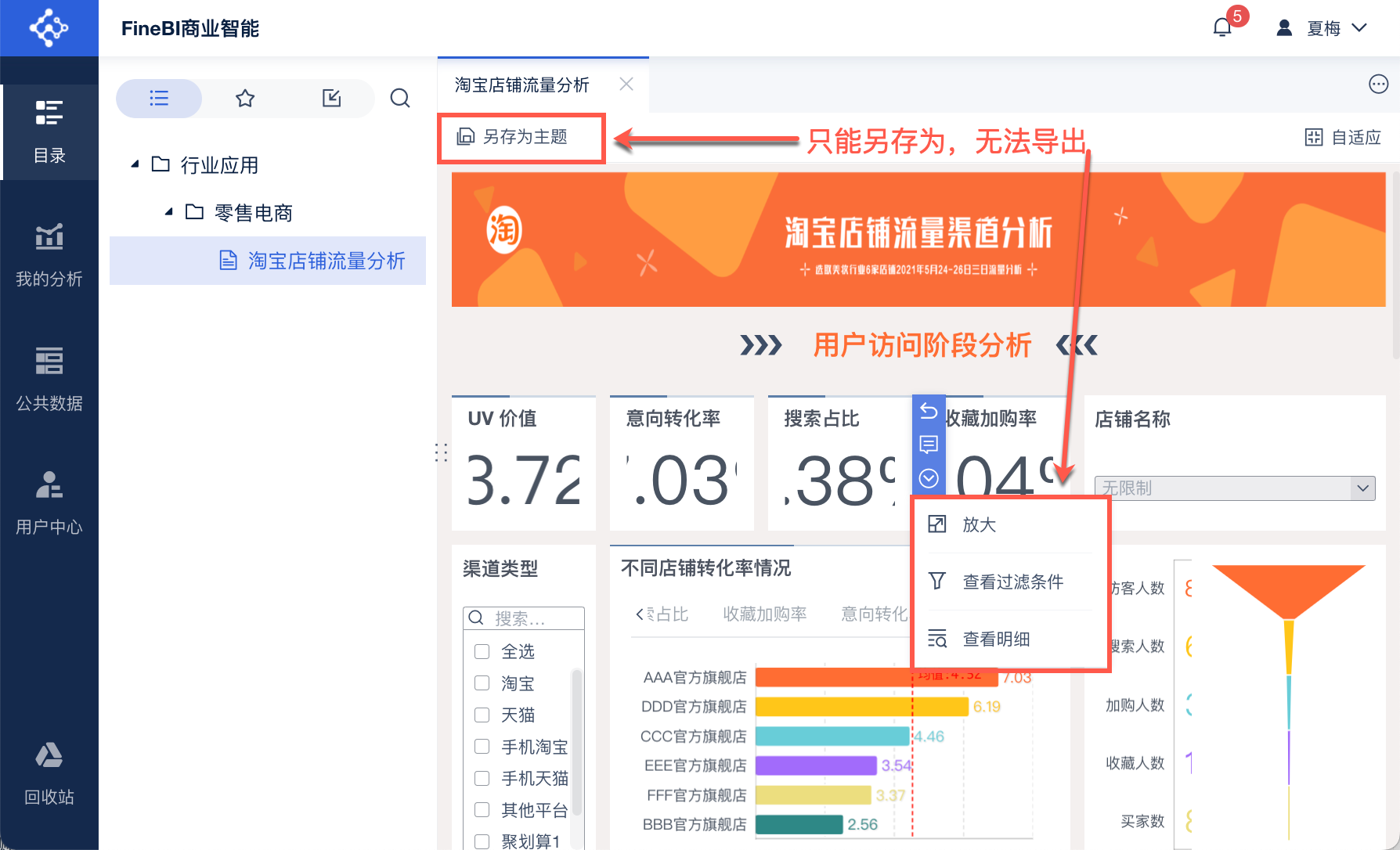 登录 Alice 账号,在目录查看整个仪表板无法导出,单个组件也无法导出,如下如所示: