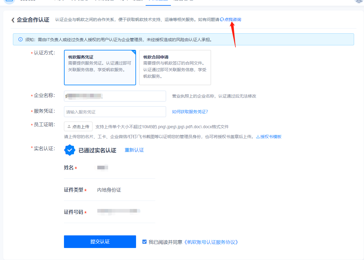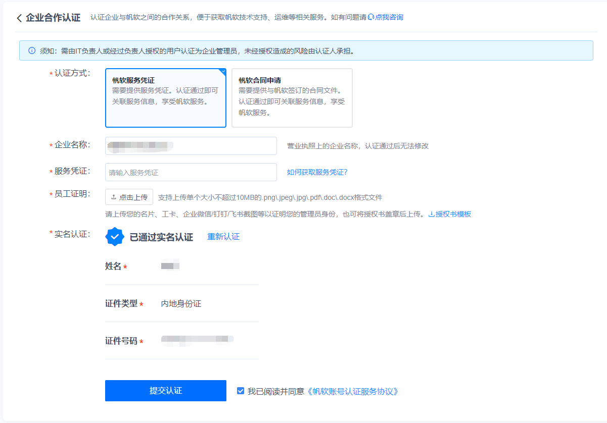 选择服务凭证或者合同方式,填写1.3节中准备好的相关资料,提交即可。