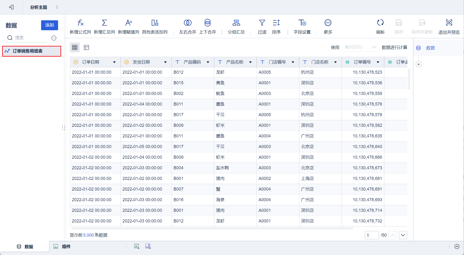 进入系统,点击「我的分析」,选中某个文件夹,点击「新建分析主题」并上传示例数据「订单销售明细表」。完成后如下图所示:
