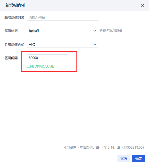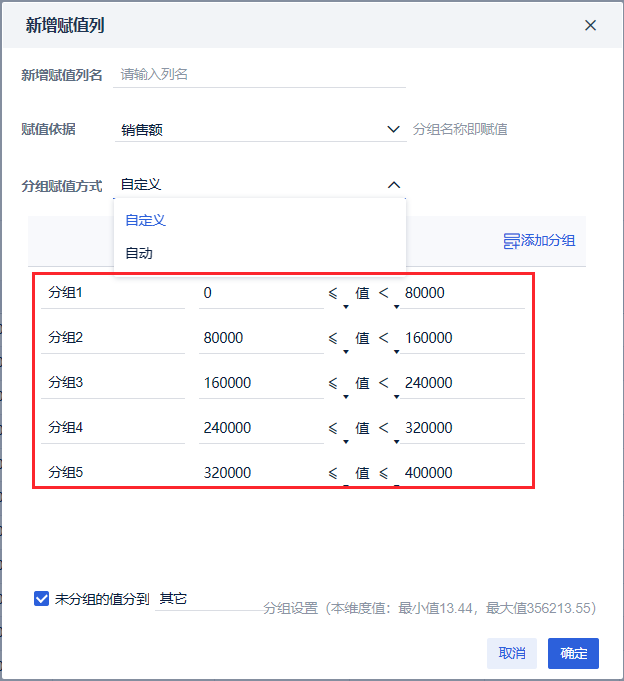 分组赋值方式选择「自动」,可以设置销售额的区间间隔,如下图所示:
