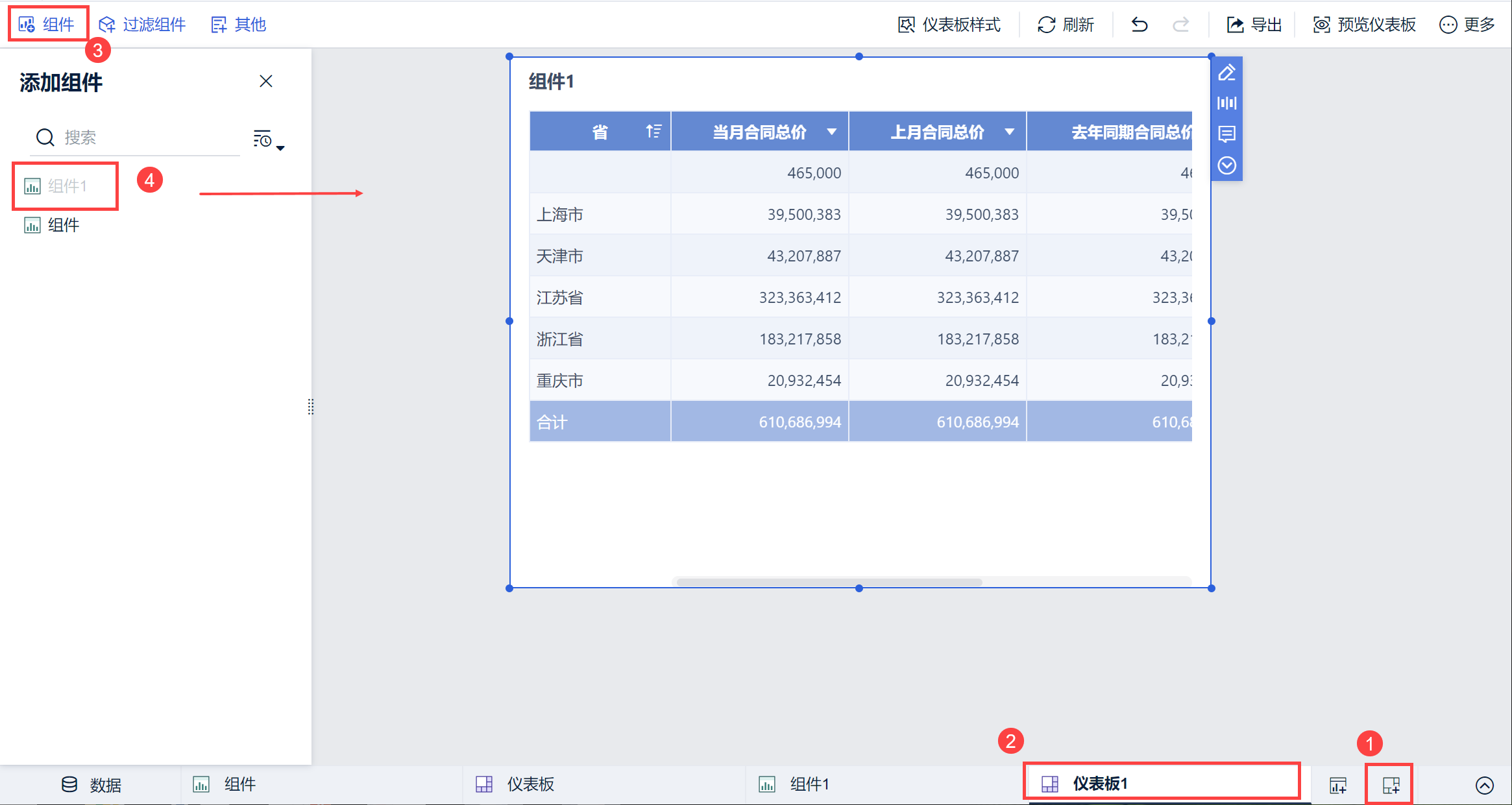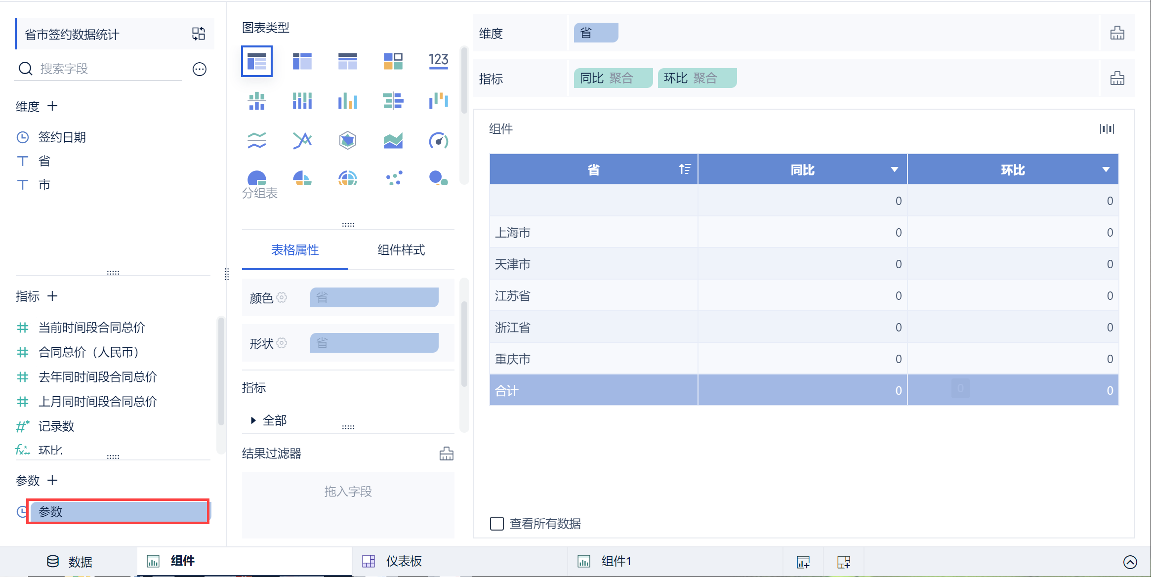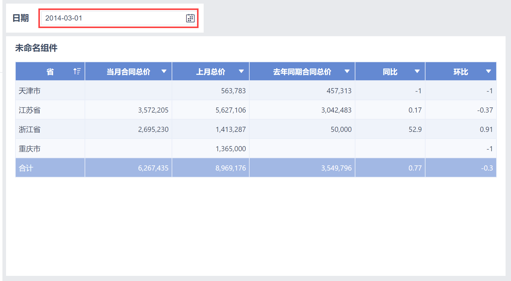 注:此处由于没有选择日期,因此同一省份当月、上月、去年同期的合同总价都相等,所以同比环比均为0,当日期过滤组件选择日期后即显示对应时间的同环比。