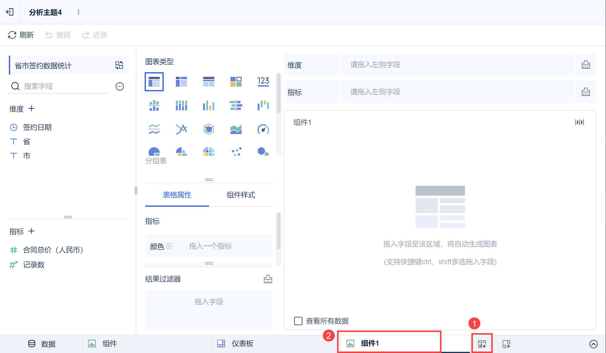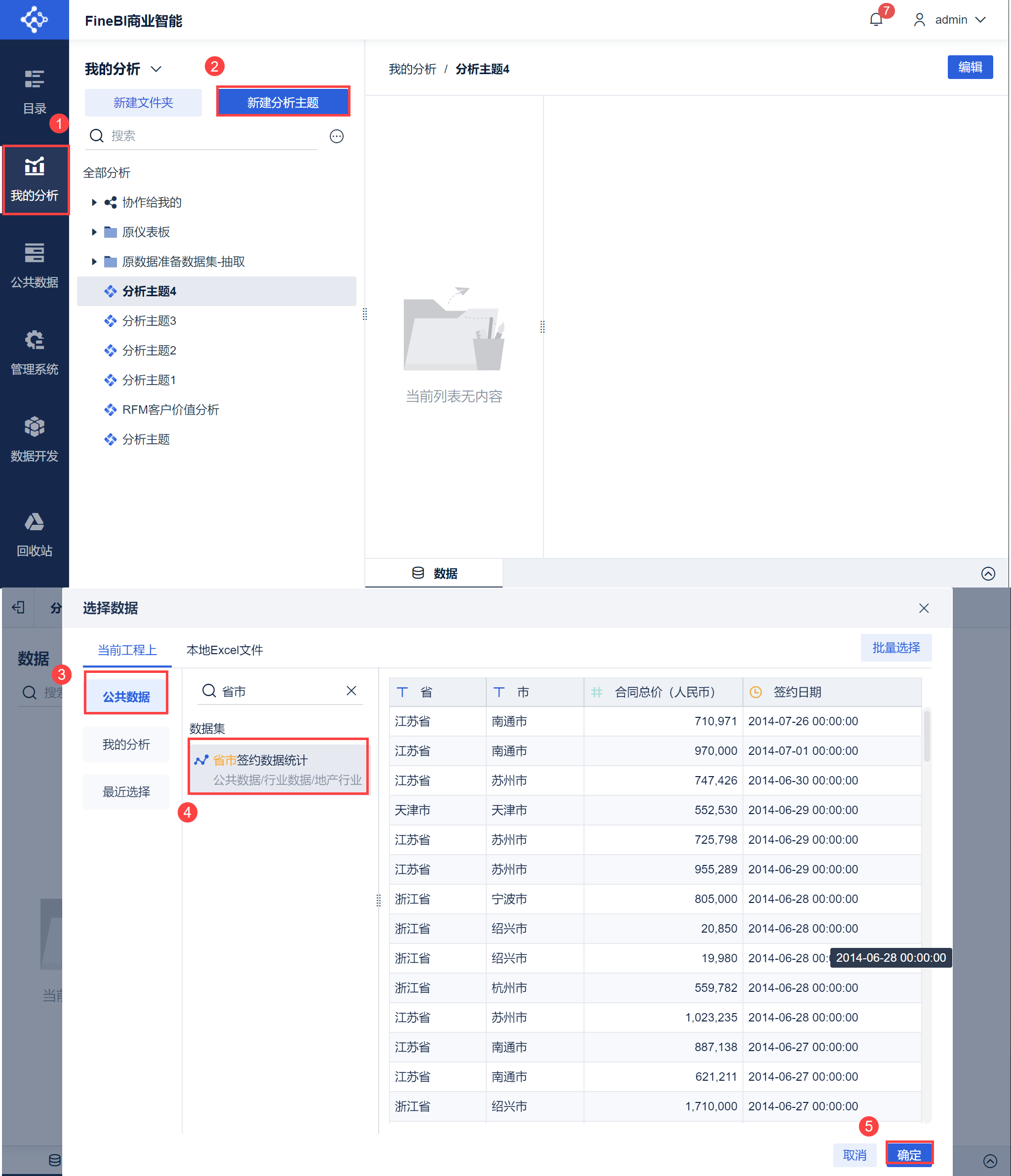 新建分析主题,将内置数据「省市签约数据统计」添加进分析主题中,如下图所示: