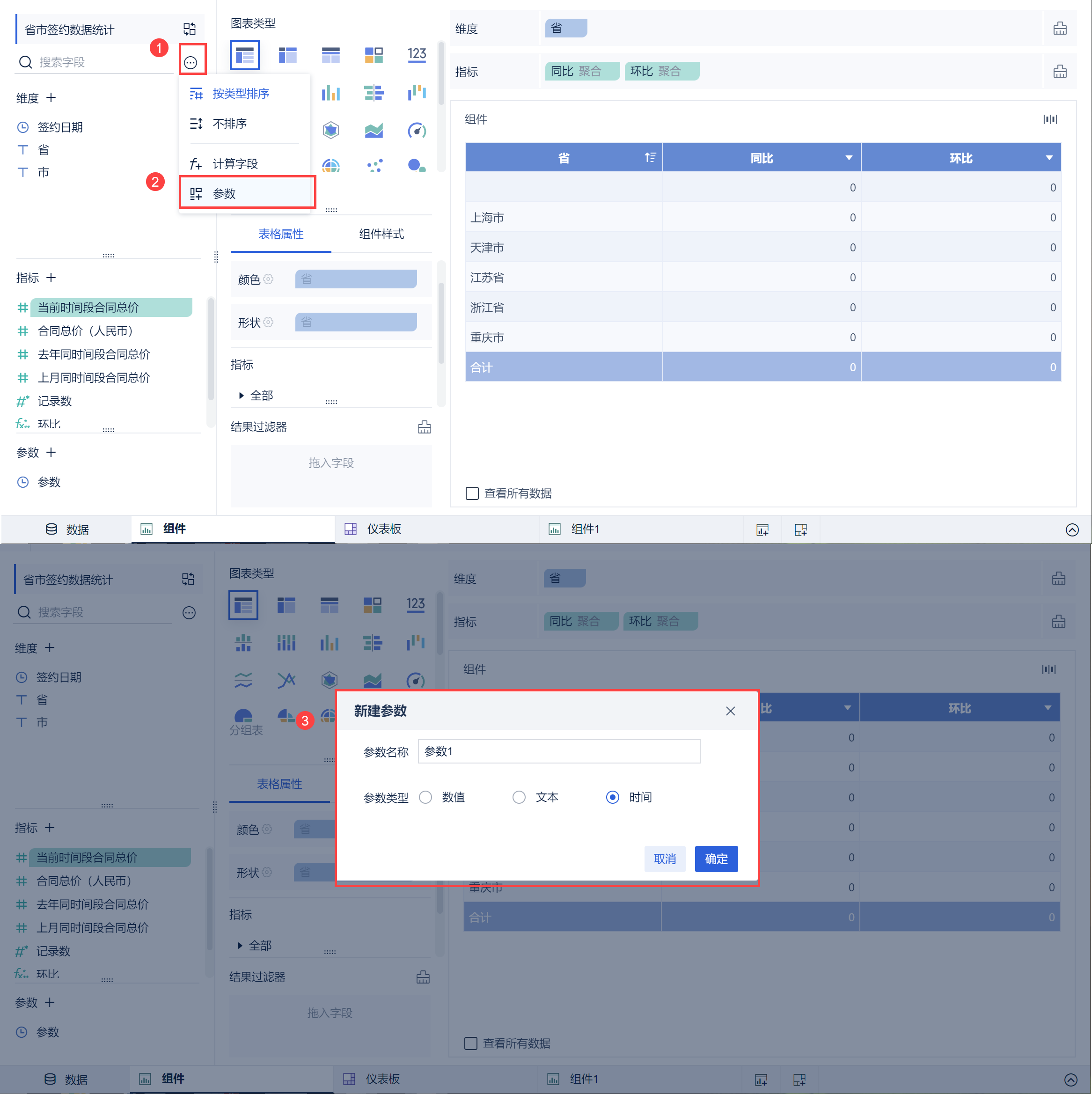 所以要求月同比和月环比,我们需要「当月合同总价」、「去年同期合同总价」、「上月合同总价」三个新字段。这三个新字段都需要绑定我们新创建的参数。步骤如下: