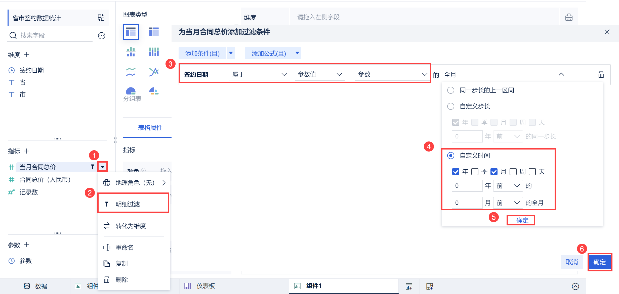 2)对「当月合同总价」字段进行明细过滤。过滤实现的效果为:对合同总价进行筛选,得到日期过滤组件所选日期当月的数据。