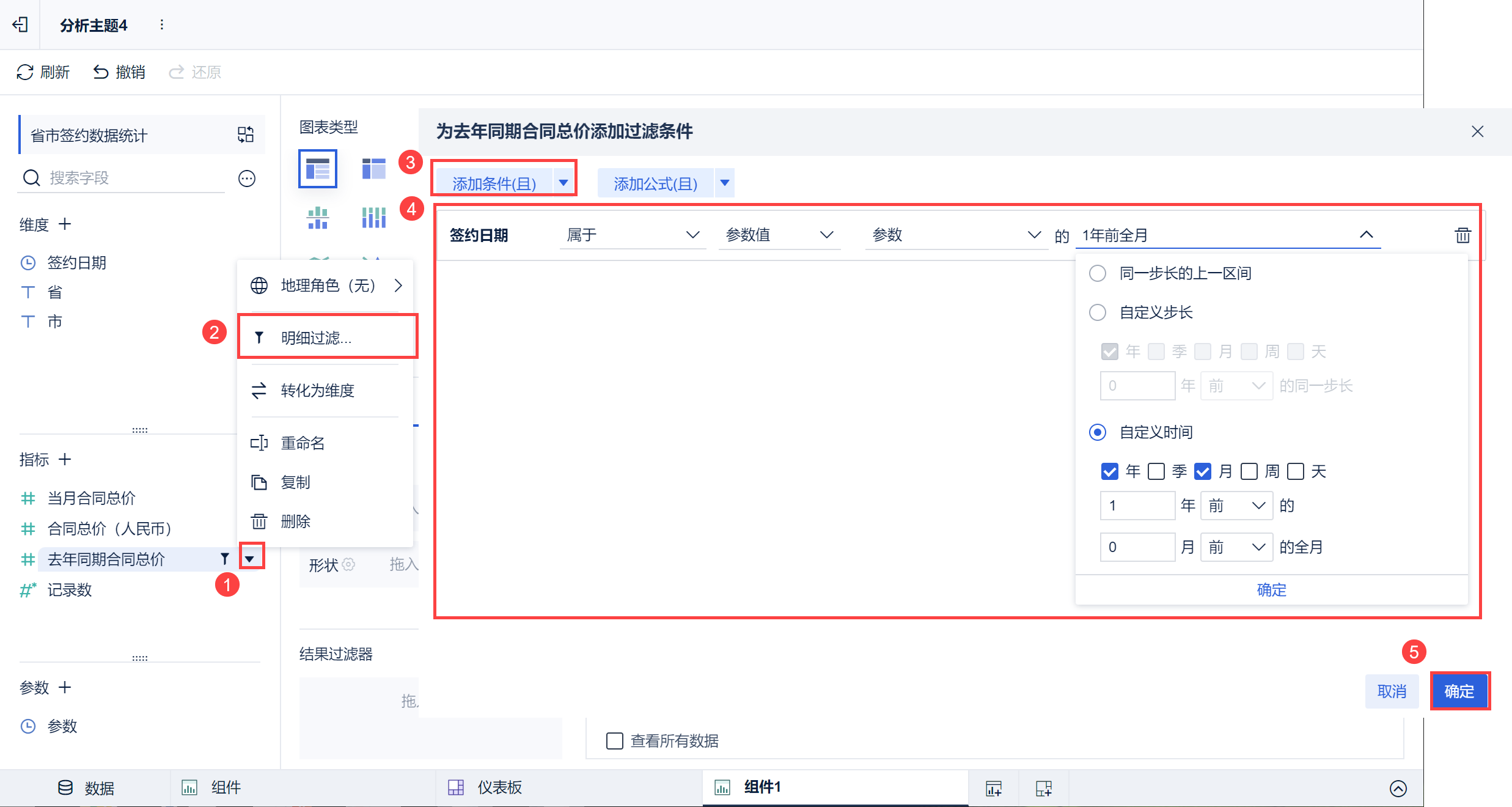 2)对「去年同期合同总价」字段进行明细过滤。过滤实现的效果为:对合同总价进行筛选,得到日期过滤组件所选日期一年前全月的数据