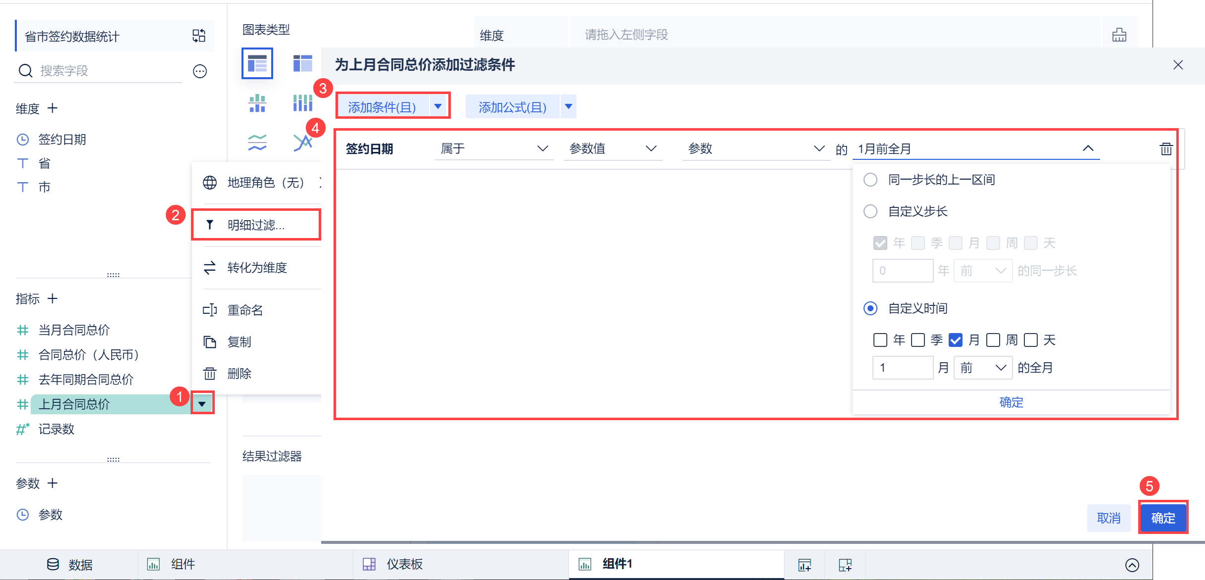 2)对「上月合同总价」进行明细过滤。过滤实现的效果为:对合同总价进行筛选,得到日期过滤组件所选日期上月的数据。