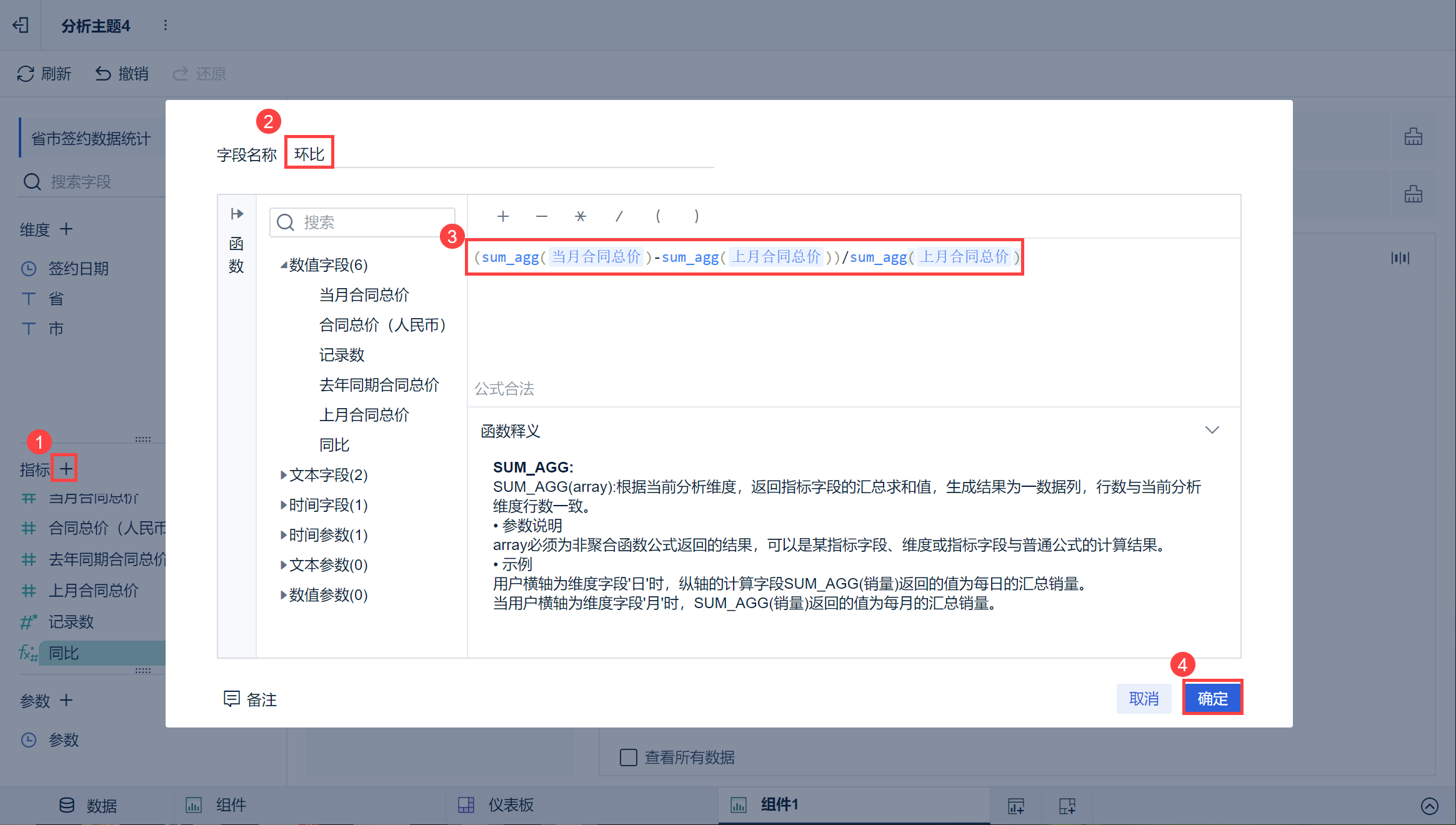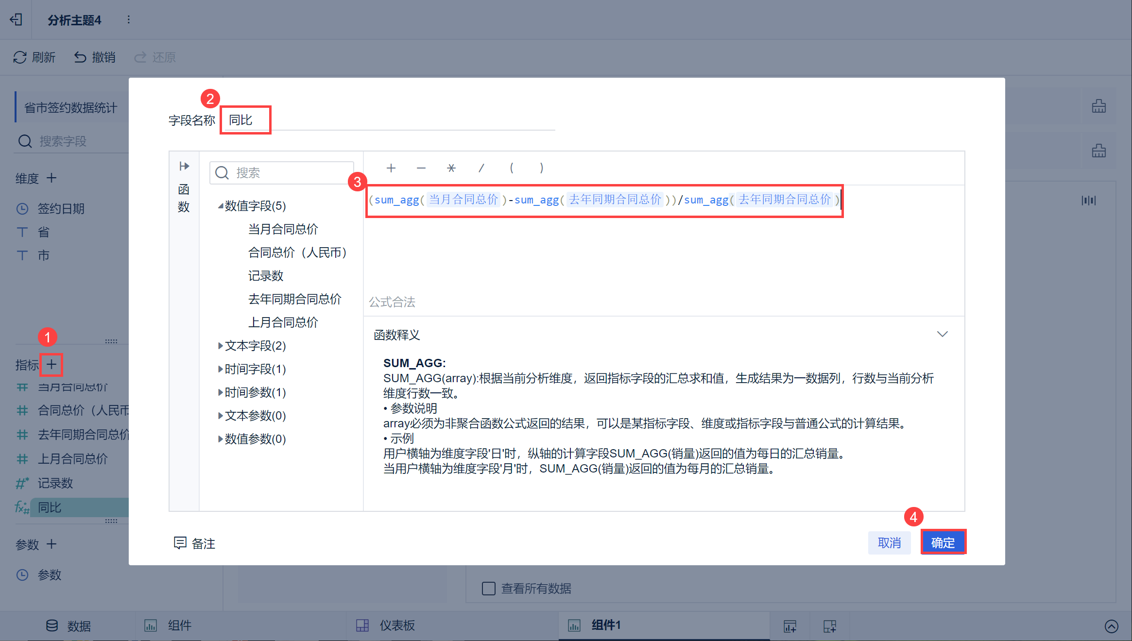 输入公式:if(ISNULL(sum_agg(去年同期合同总价)),"",(sum_agg(当月合同总价)-sum_agg(去年同期合同总价))/sum_agg(去年同期合同总价))