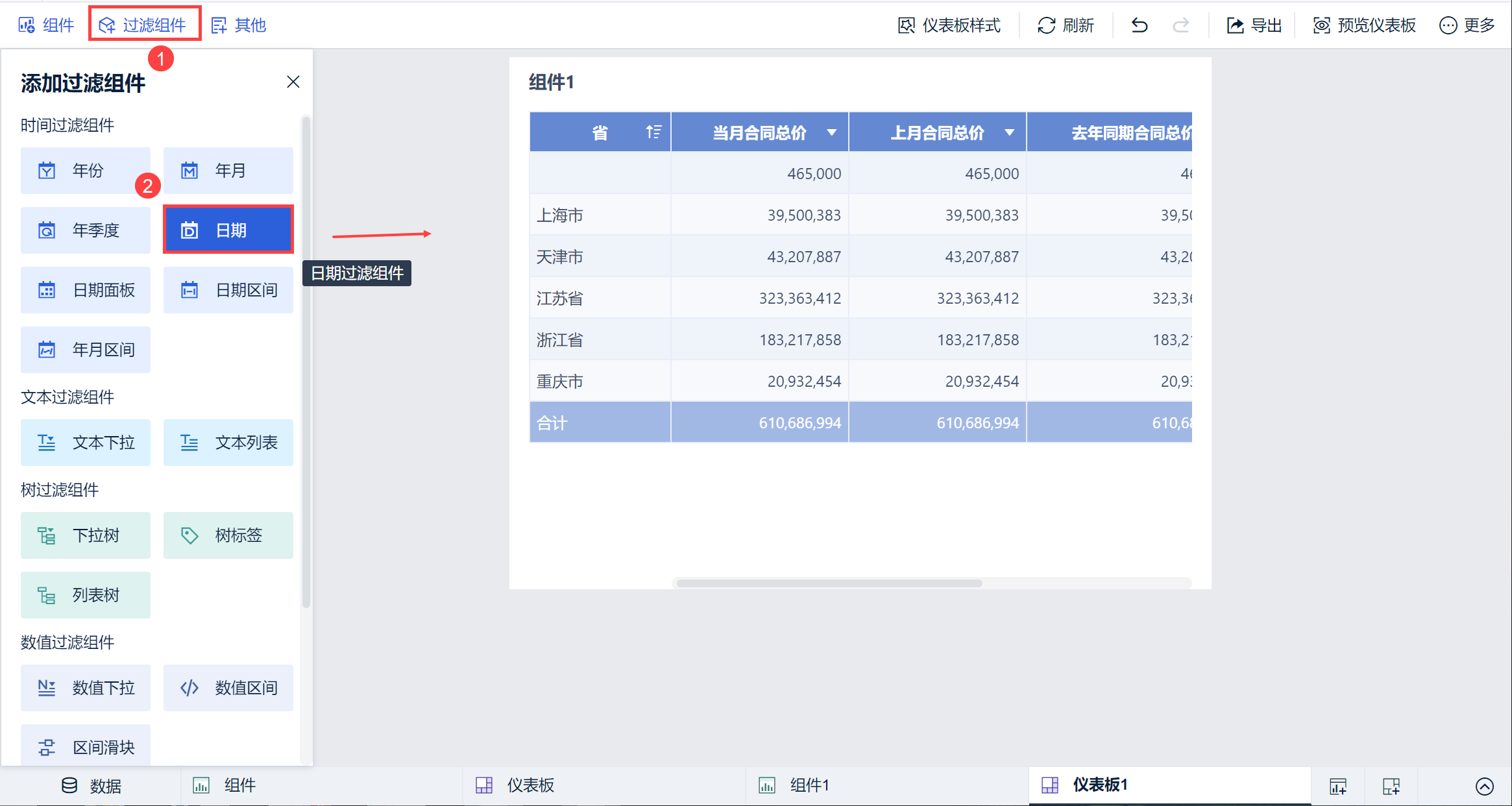 2)将日期过滤组件添加至仪表板,如下图所示:
