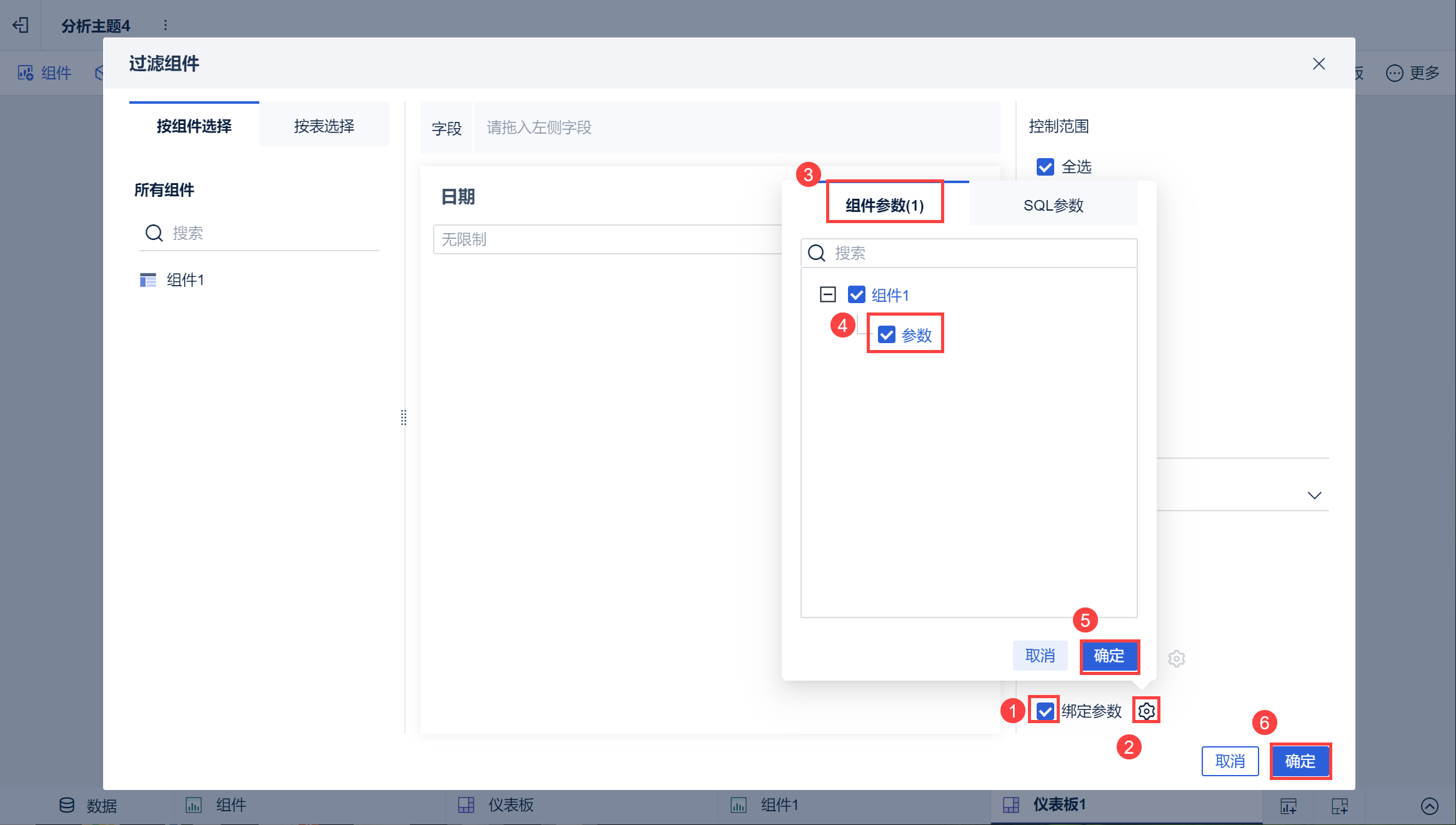 3)对过滤组件绑定参数,实现过滤组件筛选的日期即为我们新建的参数的动态日期,如下图所示: