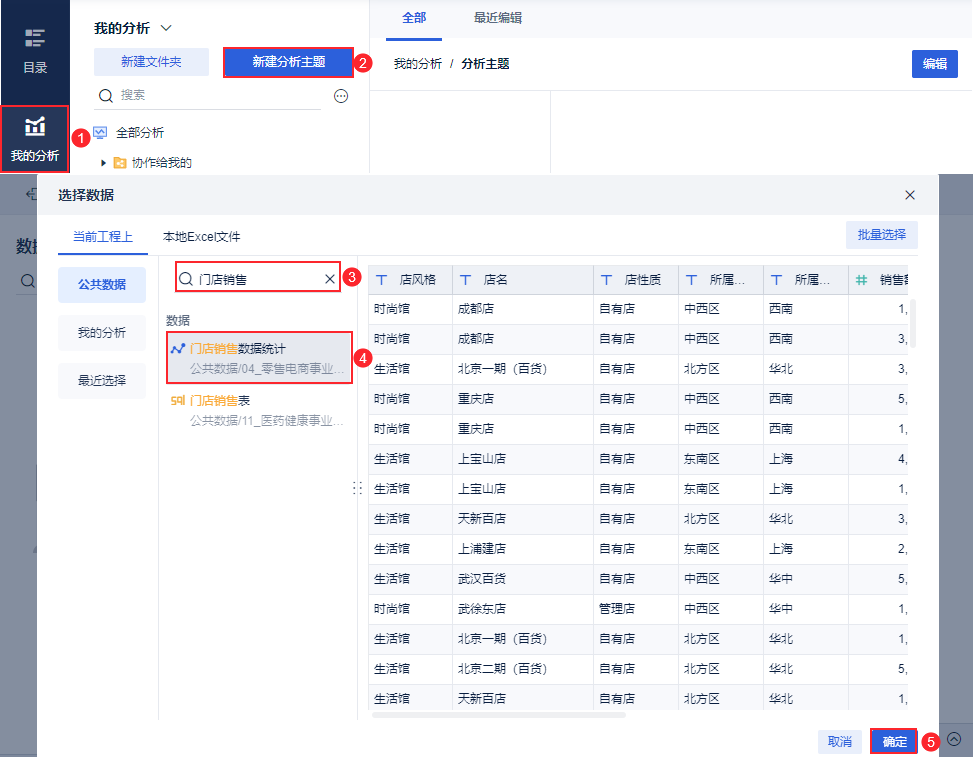 1)新建分析主题,命名为「销售额排名」,添加数据「门店销售数据统计」,默认选择所有字段,如下图所示: