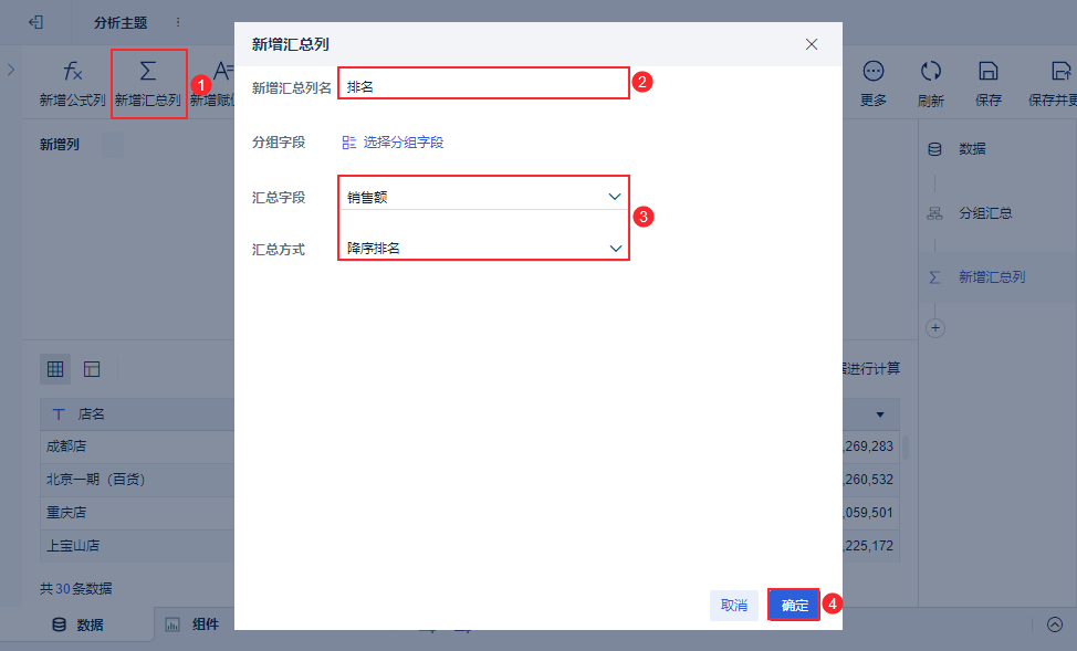 3)新增汇总列,在系统弹出框输入新增汇总列名「排名」,对销售额进行降序排名,如下图所示: