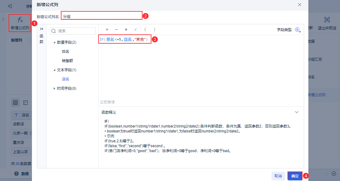 4)新增公式列,新增列名为「分组」,将销售额排名在前五的店保留店名,其余则表示为「其他」,如下图所示: