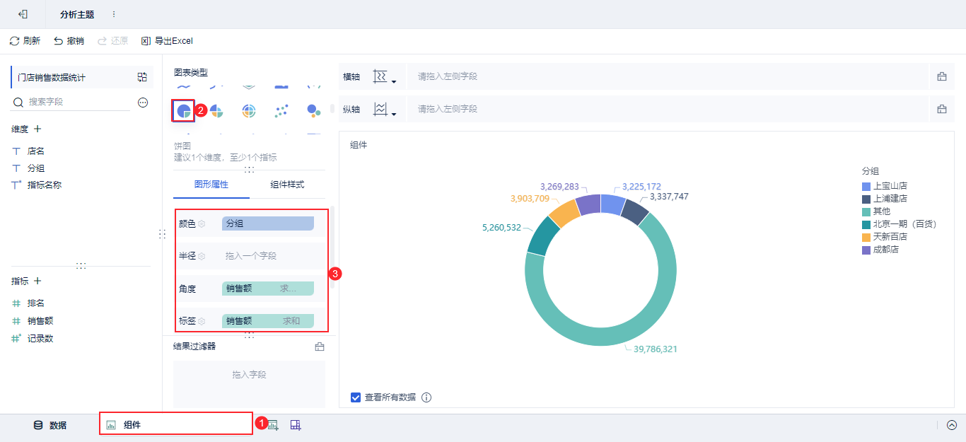 1)点击左下角「组件」,选择图表类型为饼图,将维度「分组」拖入颜色,指标「销售额」拖入角度,如下图所示: