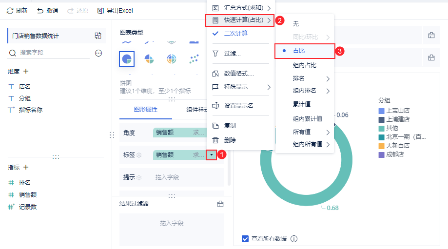 2)标签「销售额」计算类型选择占比,如下图所示: