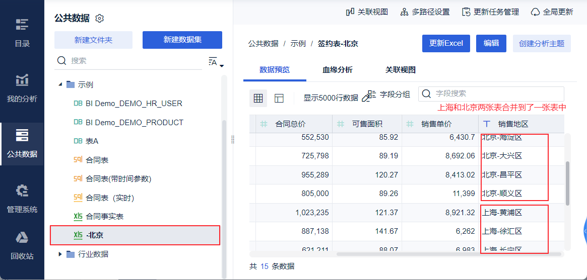 点击「合并」:字段一致的「上海」和「北京」两张表将进行上下合并,合并到一张表中。如下图所示: