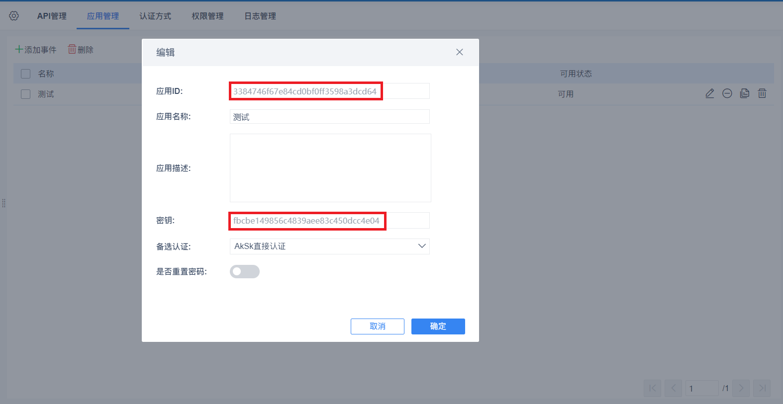在应用管理中,记下“测试”应用的应用ID和密钥两个参数,用于后续步骤中,API调用时的鉴权