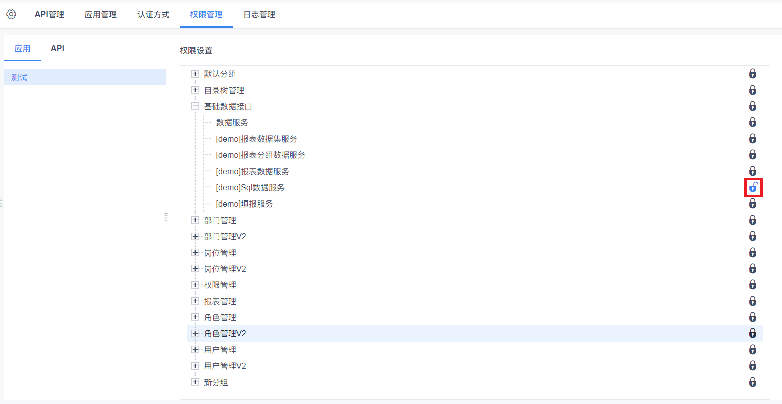 在权限管理中,选定应用为“测试”;开启基础数据接口分组中,[demo]Sql数据服务的权限。以保证该API可用