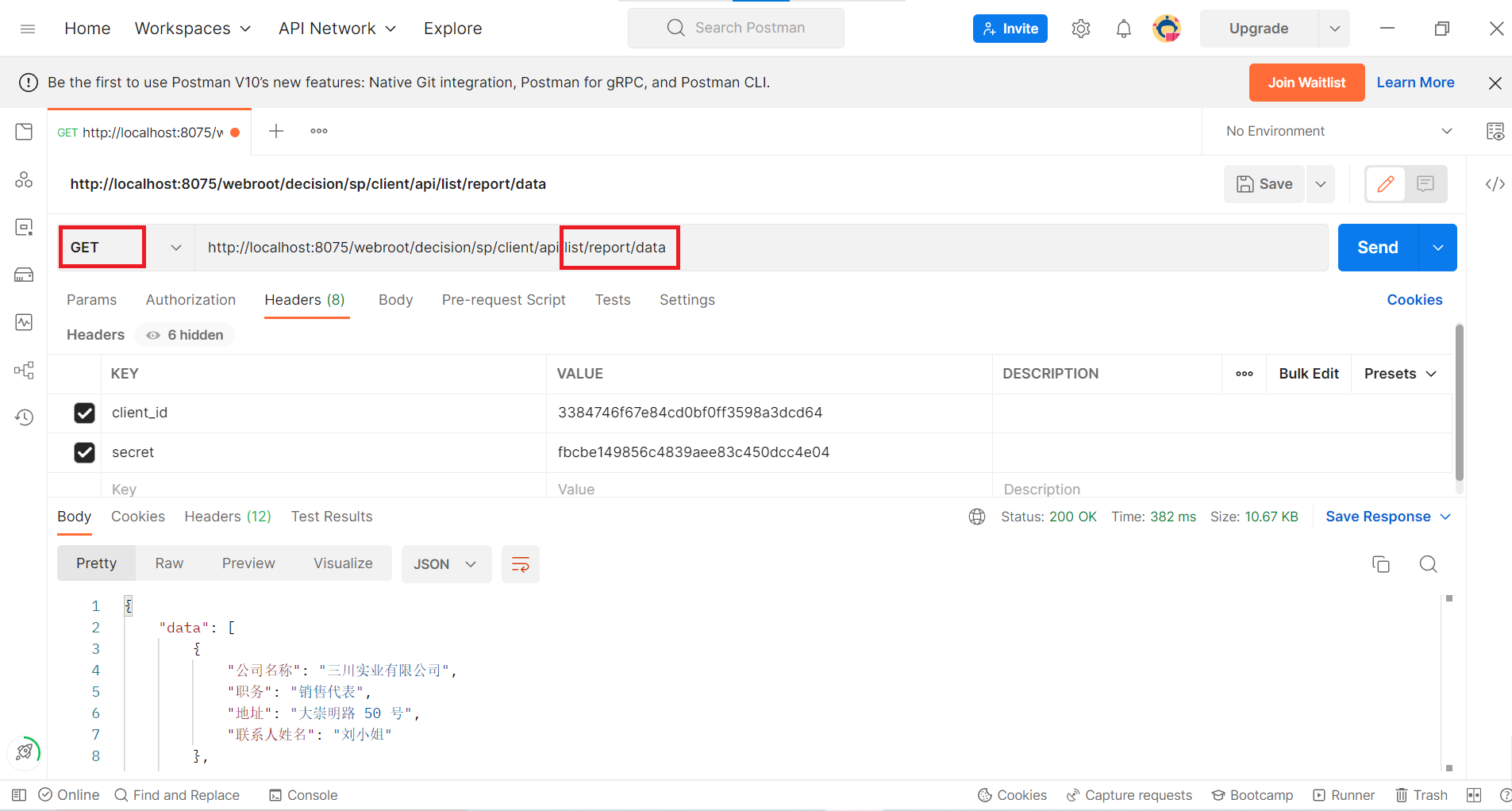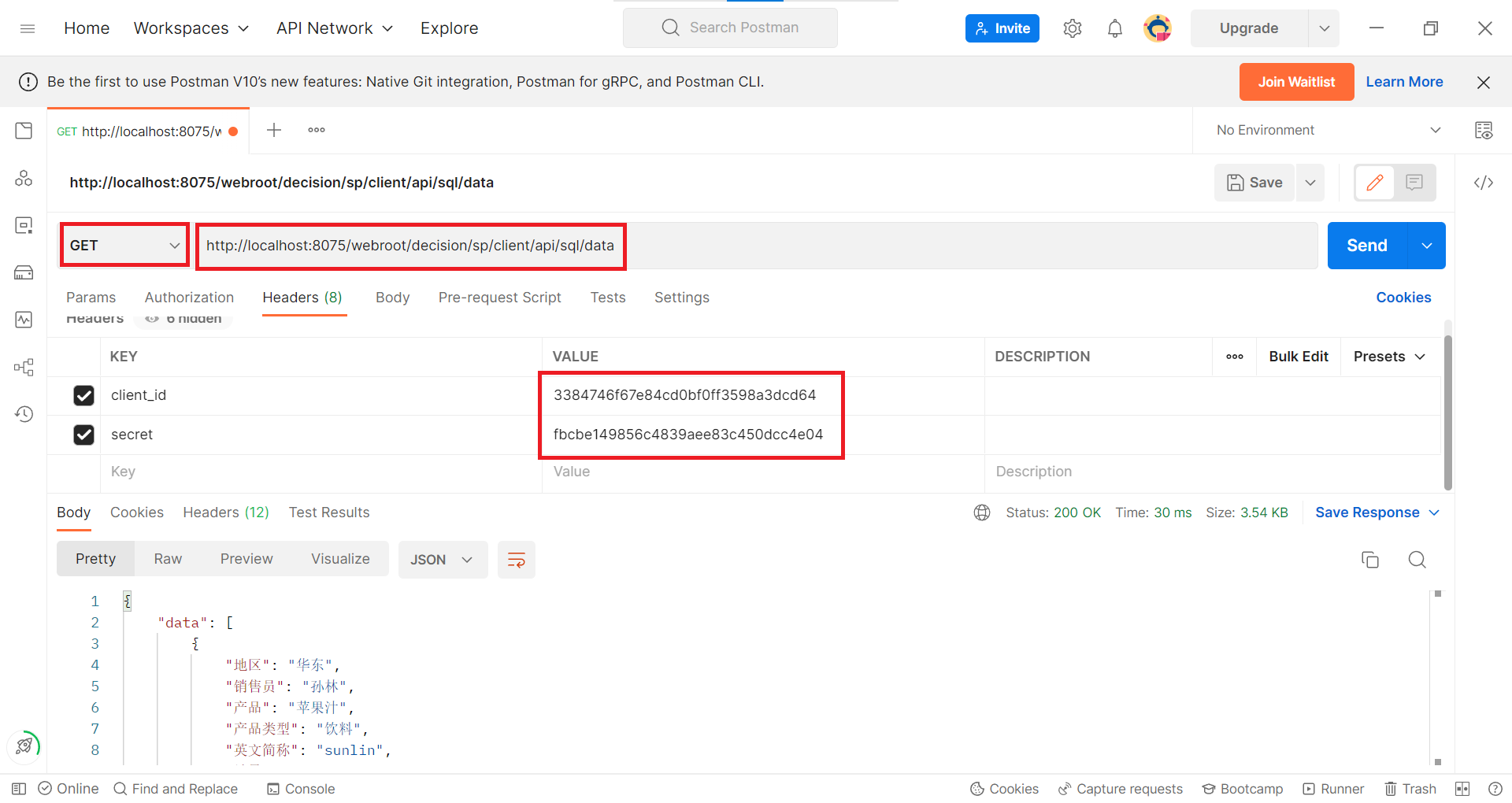 其中http://localhost:8075/webroot/decision/sp/client/api/为固定链接部分,sql/data和GET分别为API路径和API方法;