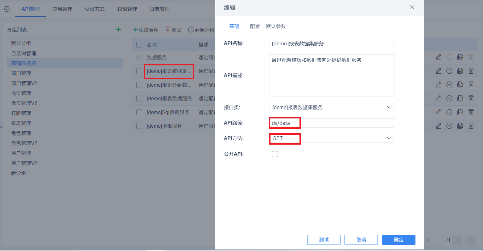 1)在API管理的基础数据接口中,点击[demo]报表数据集服务的编辑按钮,进行API信息的配置