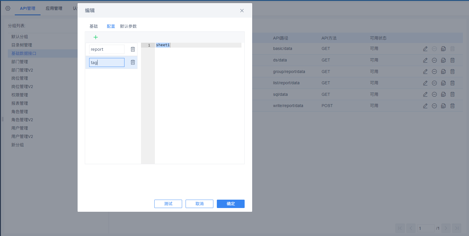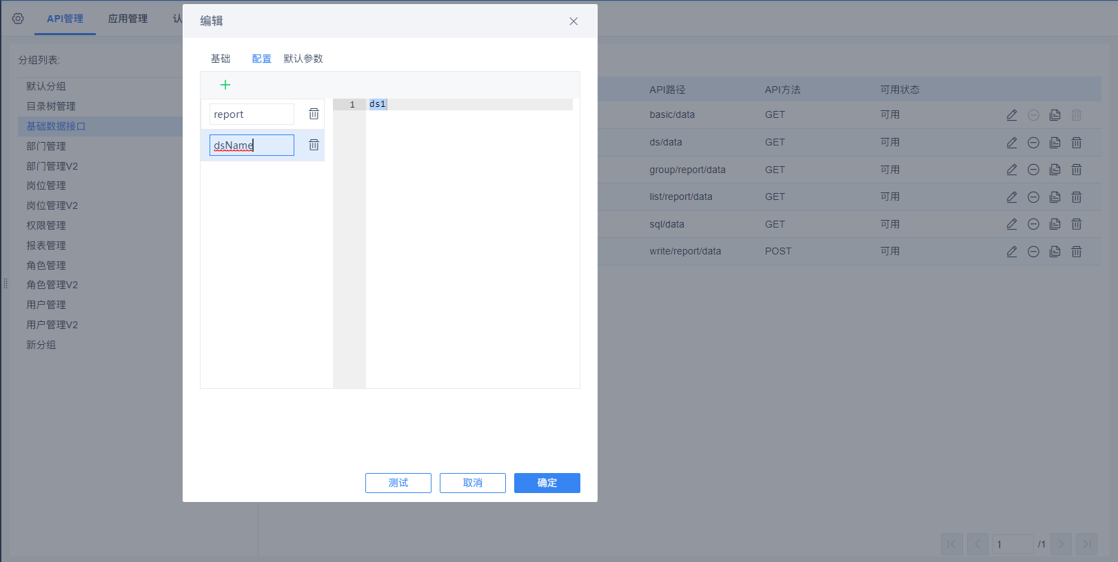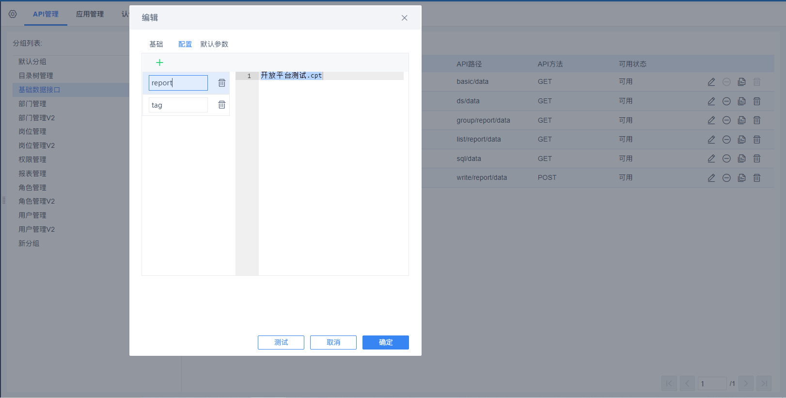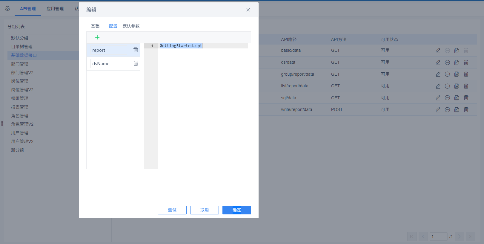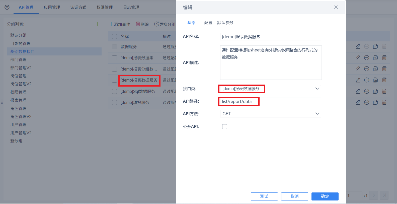 1)在API管理的基础数据接口中,点击[demo]报表分组数据服务的编辑按钮,进行API信息的配置