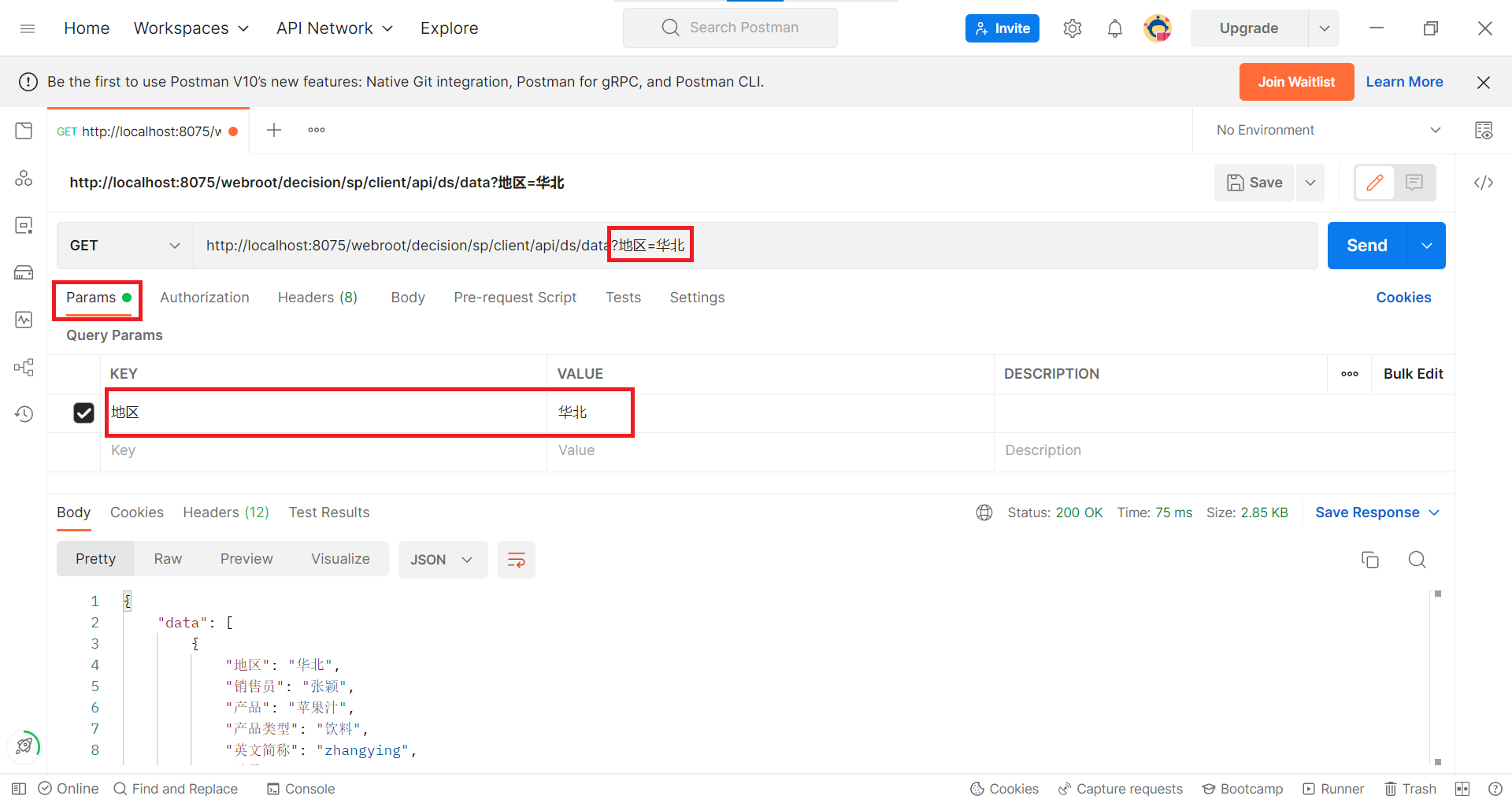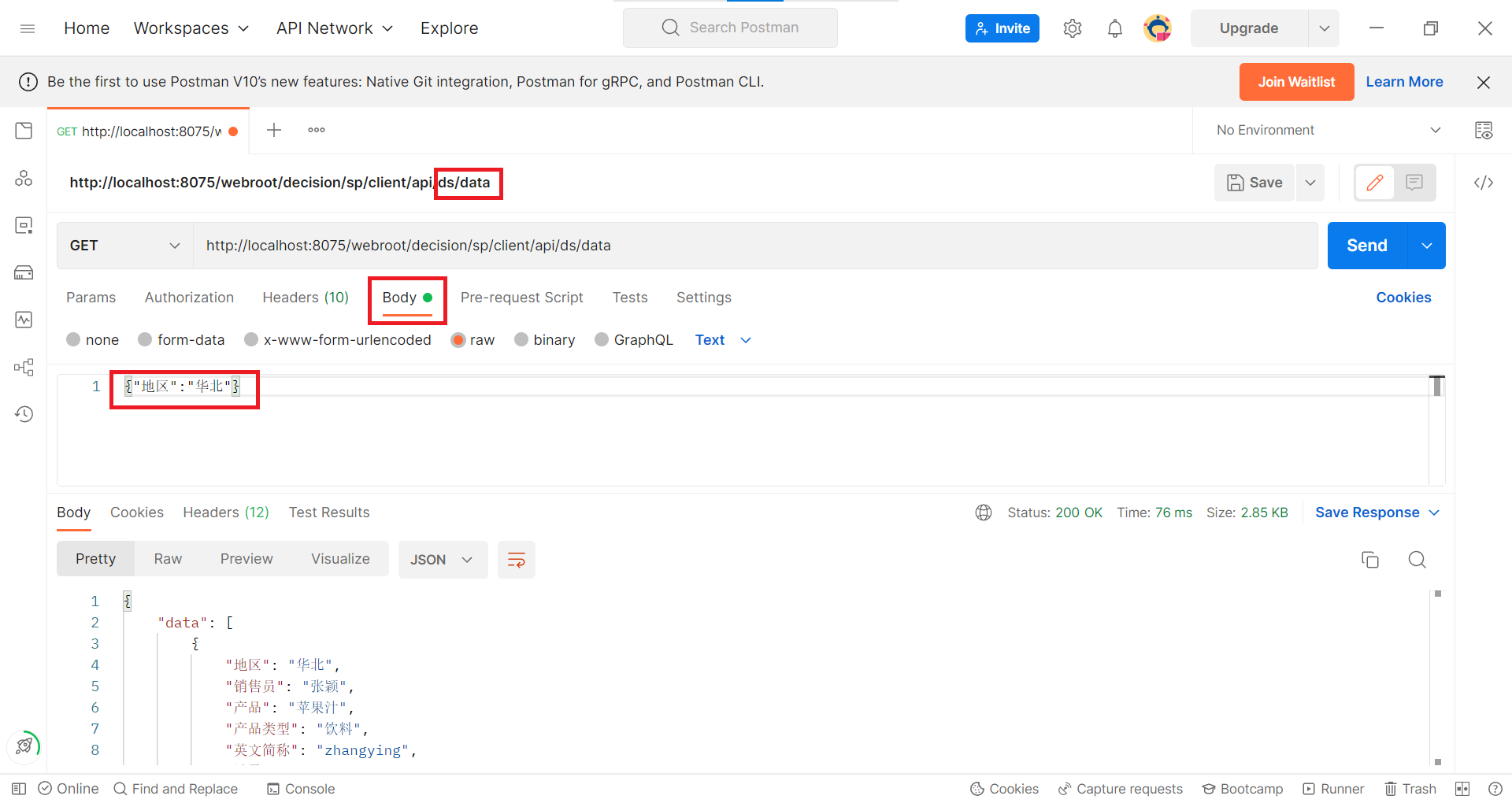 这里有两种传参方式可用,一种是在Body中写入地区信息:{“地区”:“华北”}