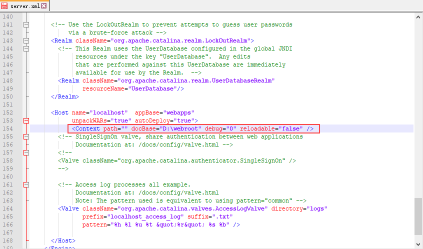 <Context path="" docBase="D:\webroot" debug="0" reloadable="false" />