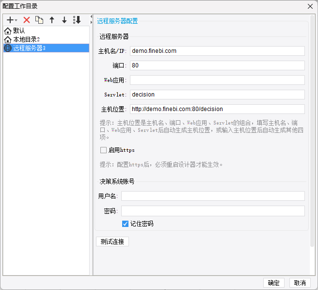 在使用报表 远程设计 输入服务器地址的时候,webroot 需省去,decision 要保留,详情如下所示: