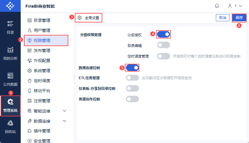超级管理员登录数据决策系统,点击「管理系统>权限管理>全局设置」,打开「分级授权」和「数据连接控制」,点击「保存」。如下图所示: