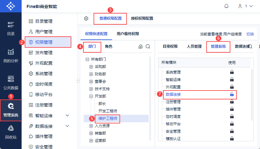超级管理员登录数据决策系统,点击「管理系统>权限管理>权限配置」,选择权限载体「部门/角色/用户」,选择具体项,打开「管理系统>数据连接>查看权限」。如下图所示: