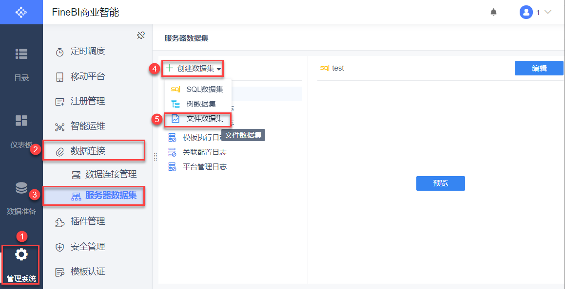 拥有权限的用户登录 BI 工程,点击「管理系统>数据连接>服务器数据集」,选择「创建数据集>文件数据集」,如下图所示: