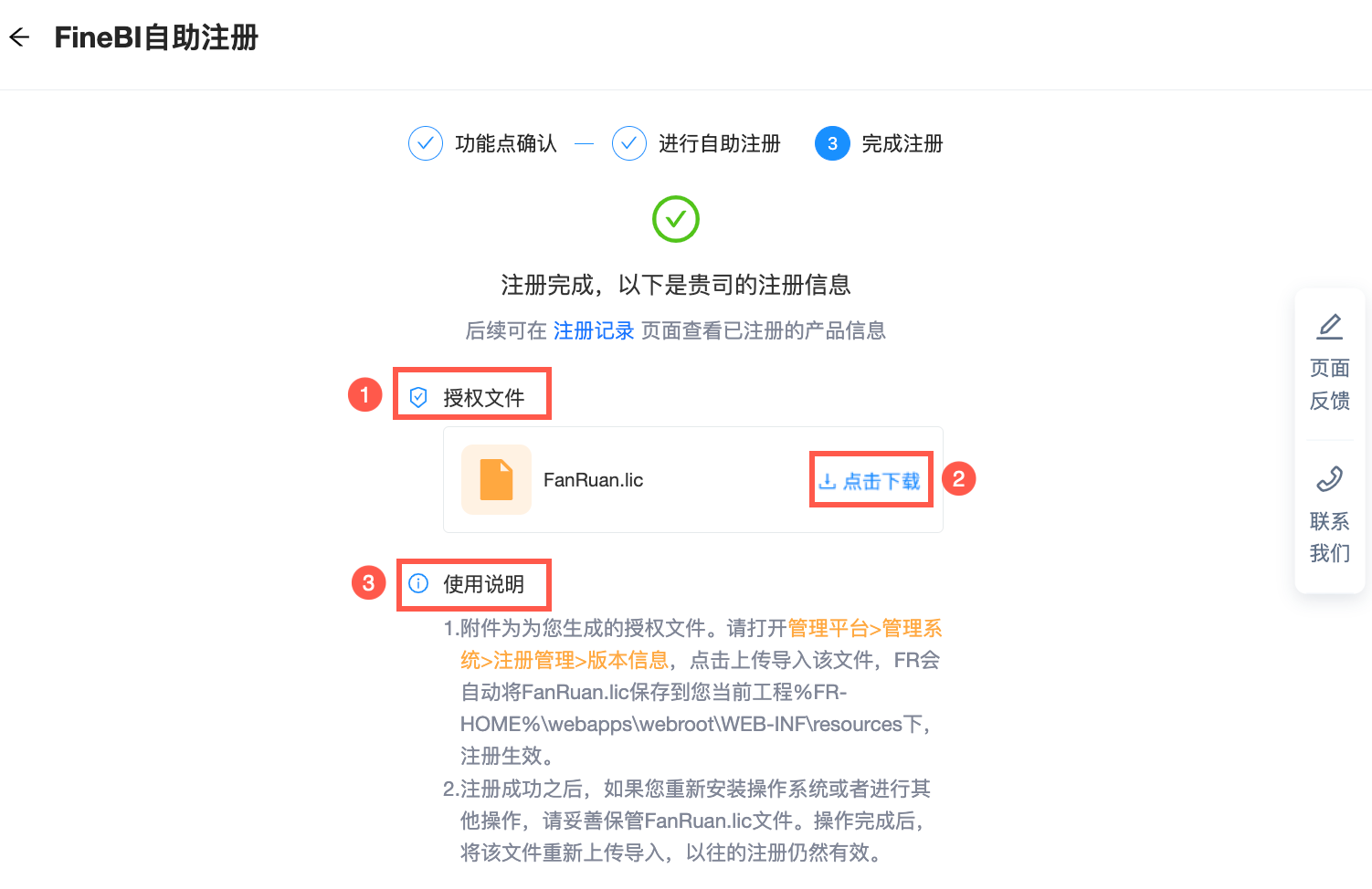 注1:产品注册功能仅支持企业在帆软产品合同中指定的注册人员使用。