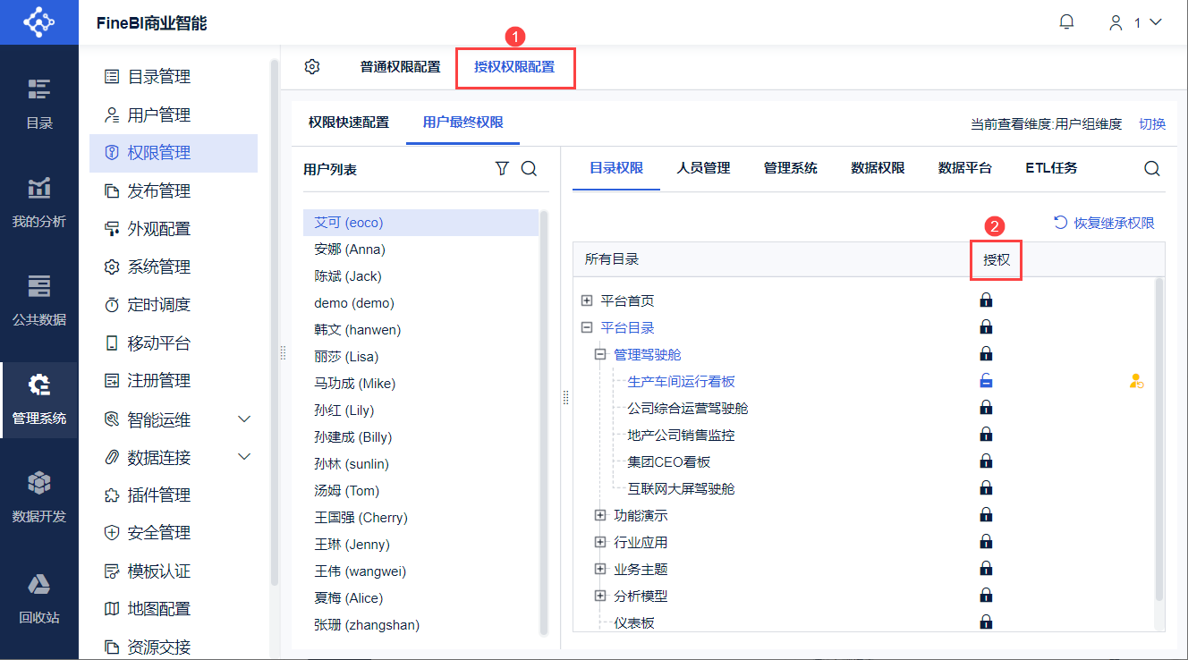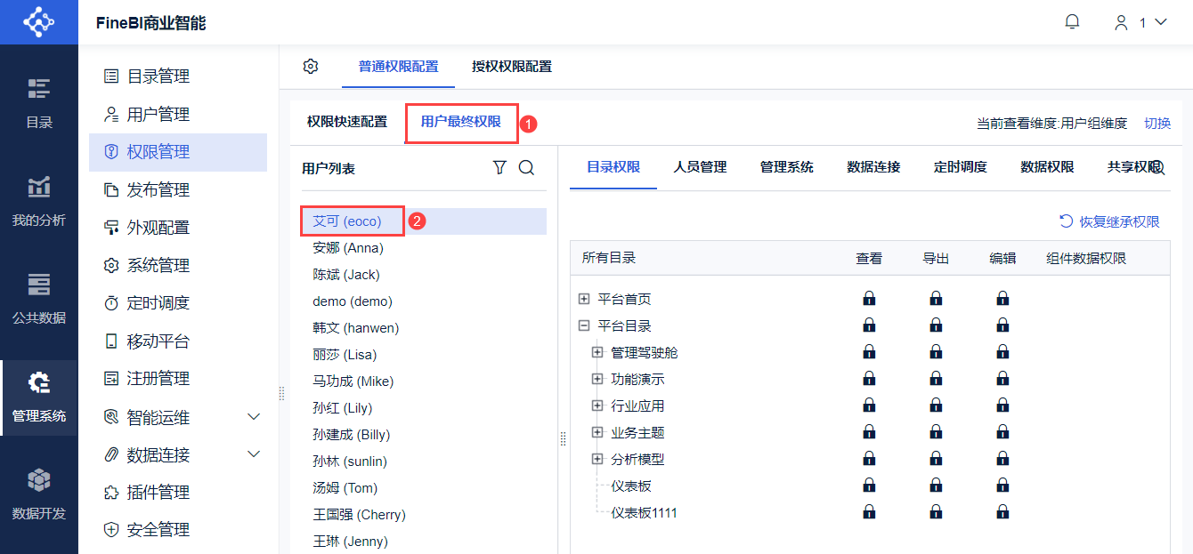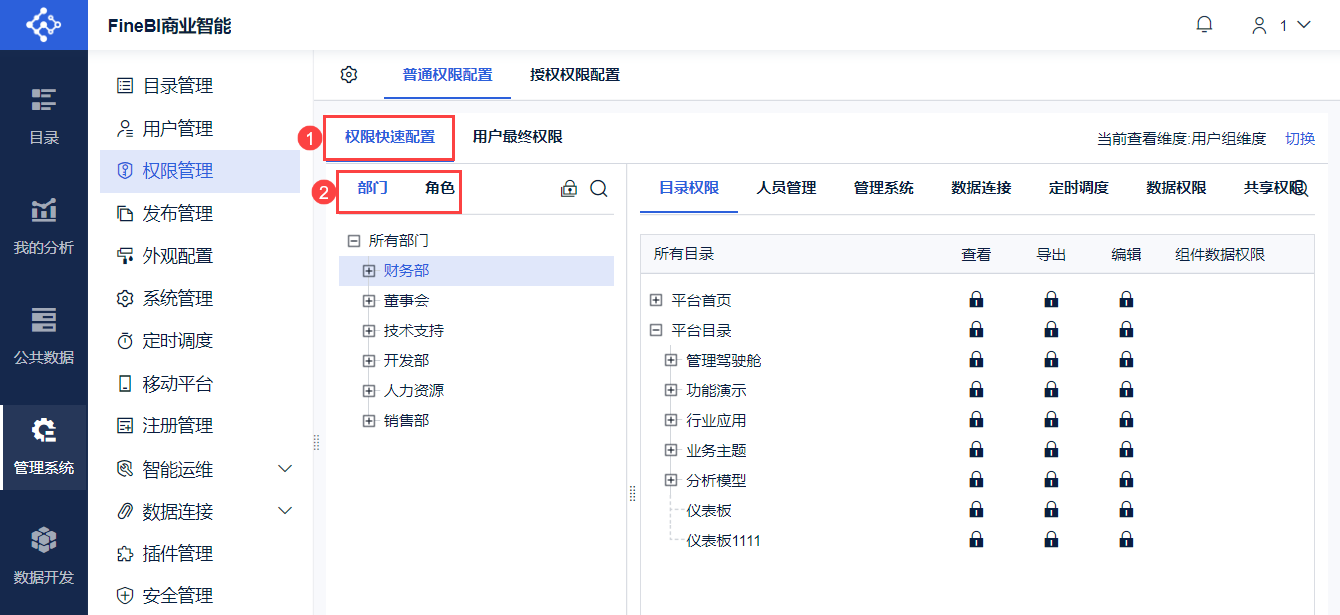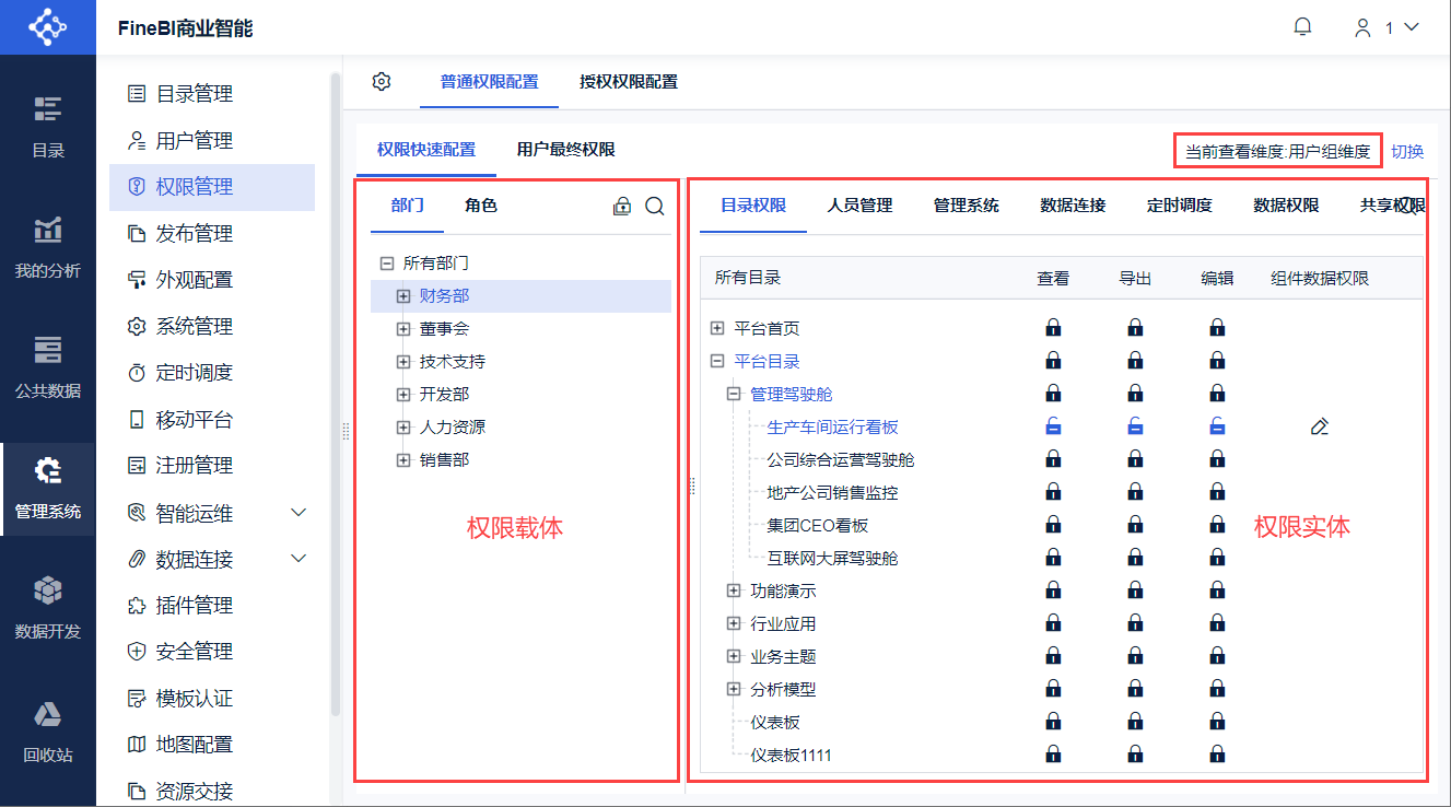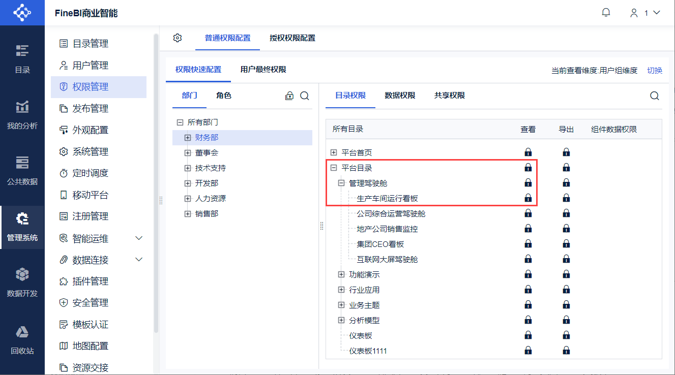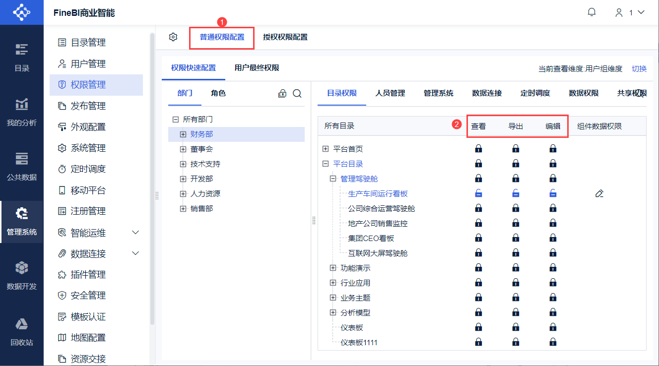 FineBI系统中默认只能配置「目录权限」、「数据权限」、「共享权限」。