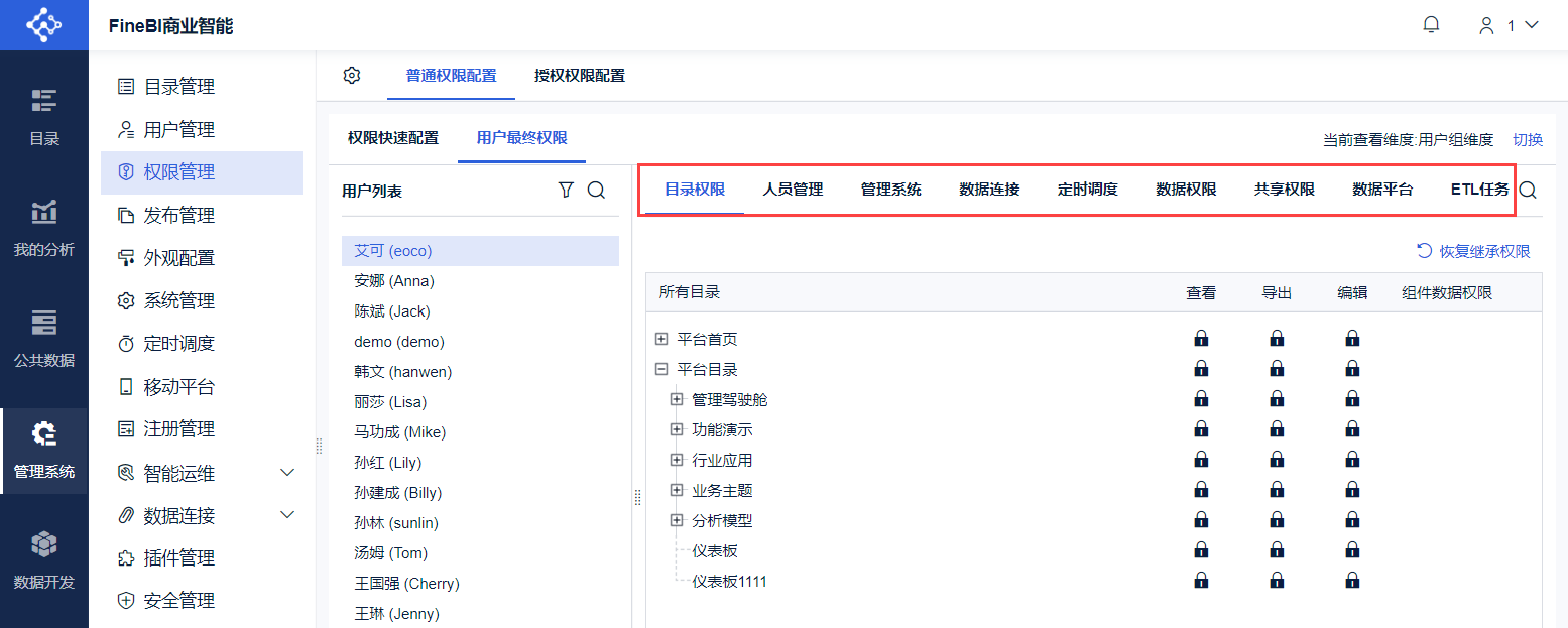包括:目录权限、人员管理、管理系统、数据连接、定时调度、数据权限、共享权限、数据平台、ETL任务。如下图所示: