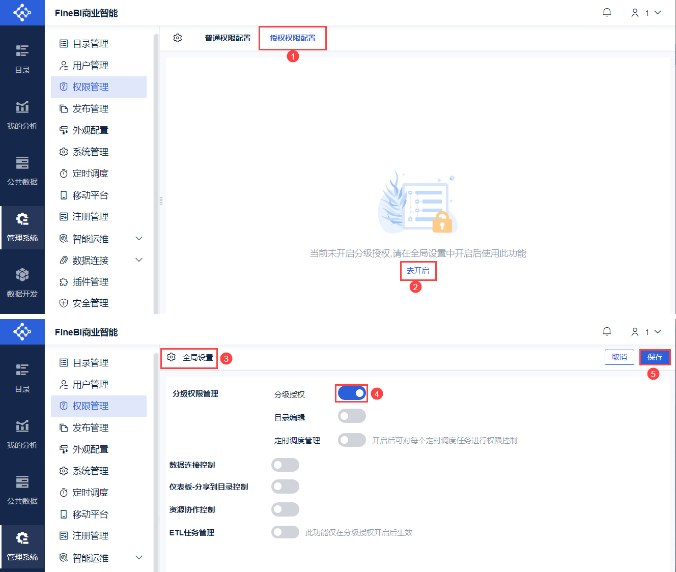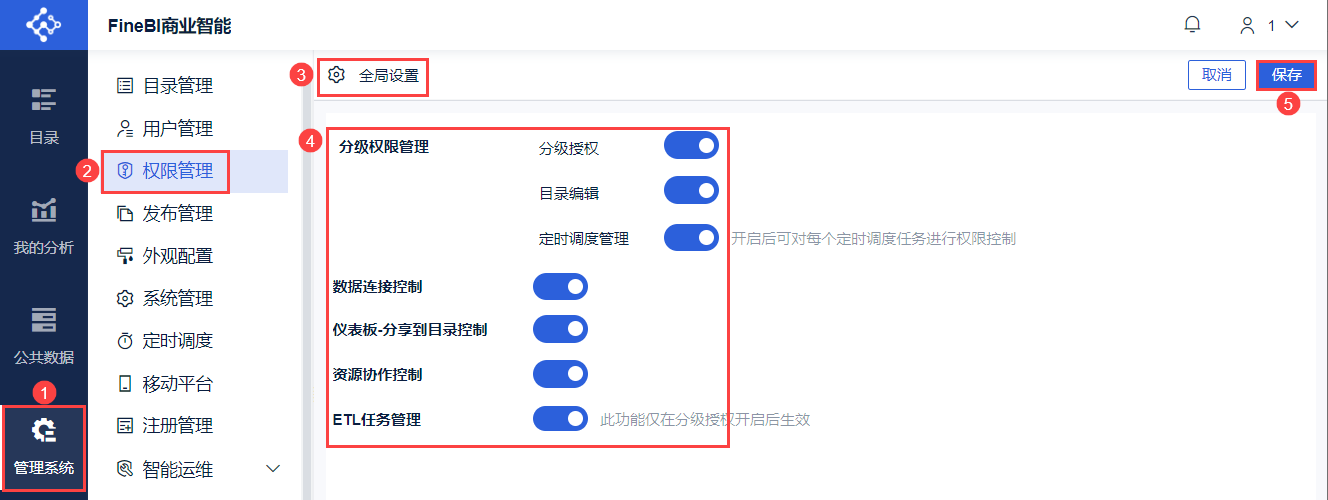 如需开启其他权限配置,超级管理员登录FineBI系统,点击「管理系统>权限管理>全局设置」,打开对应设置,点击「保存」,如下图所示: