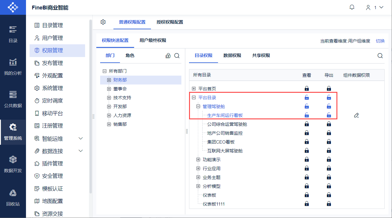 查看数据决策系统的目录权限配置,当目录收起时,管理员无法确认子节点有无权限。可通过目录权限配置左侧文字是否高亮,判断权限配置情况。