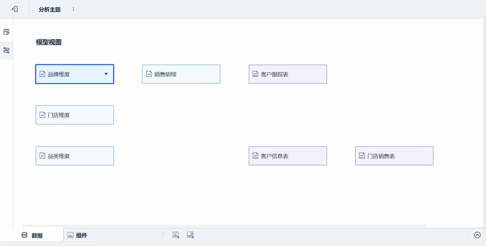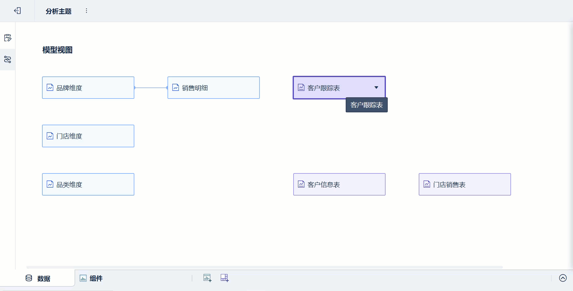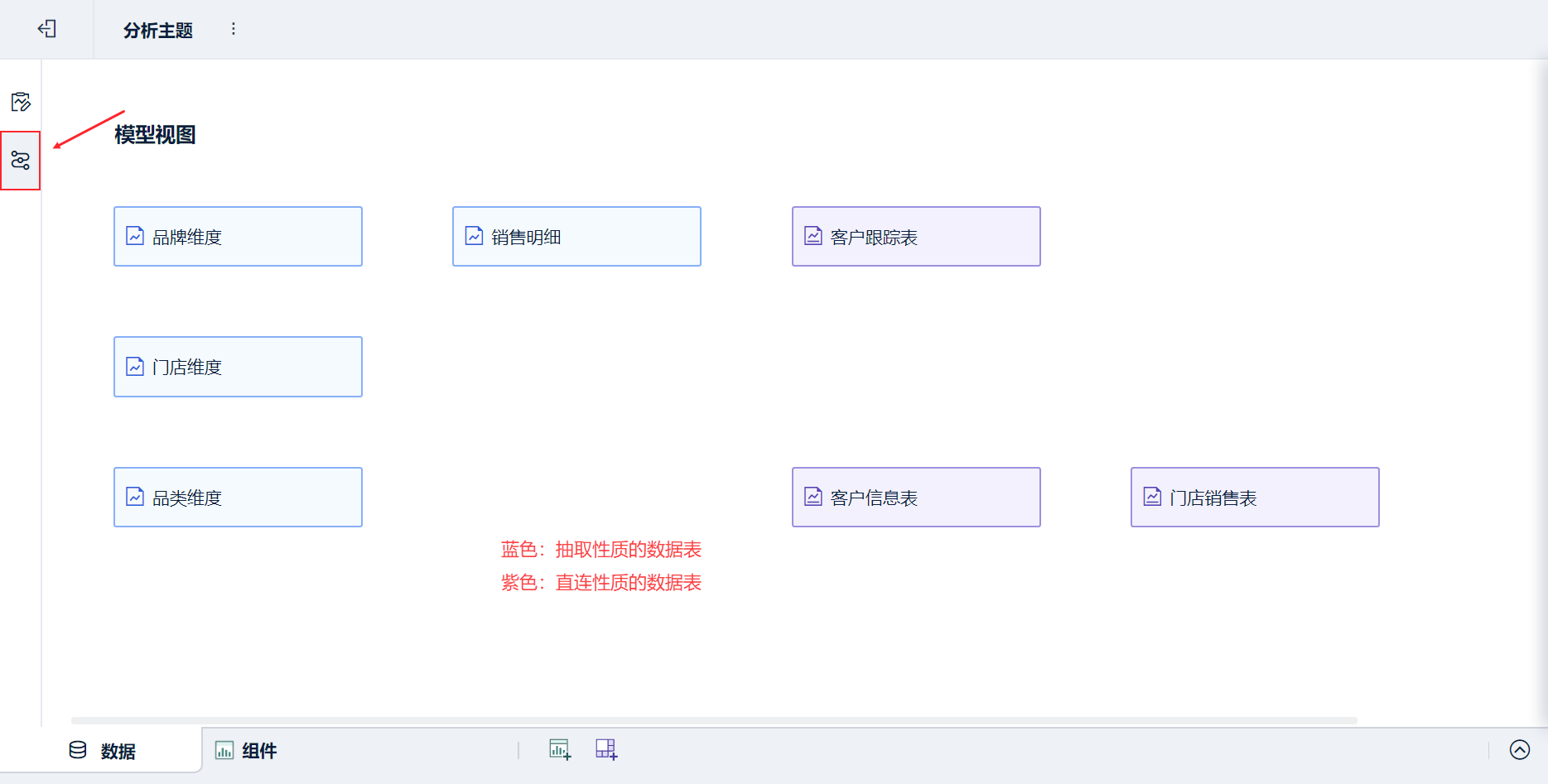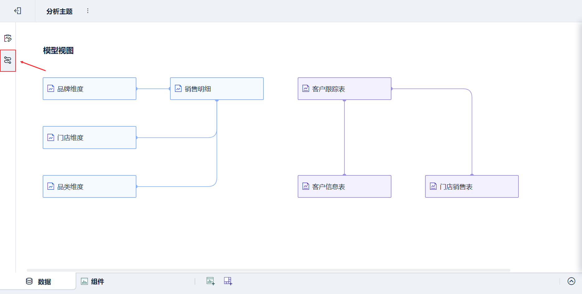 在主题的「数据tab」下,点击如下图的图标即可进入主题模型的设置界面。通过拖拽的方式可以设置表与表之间的模型关系。