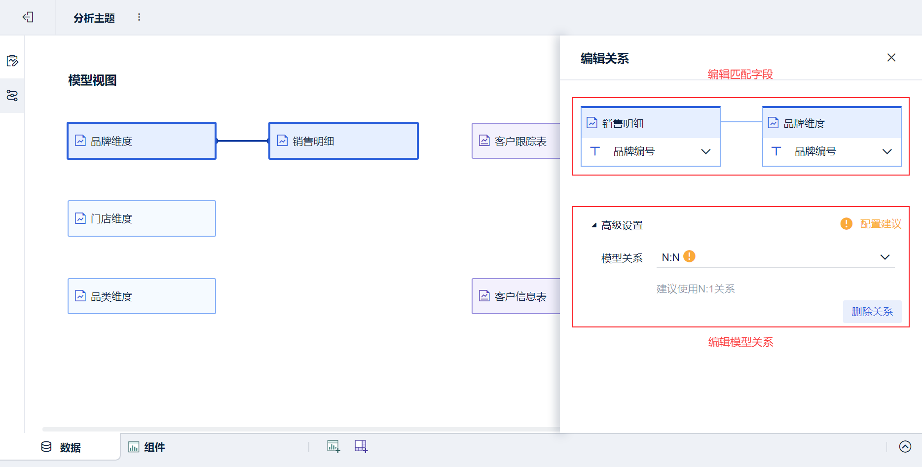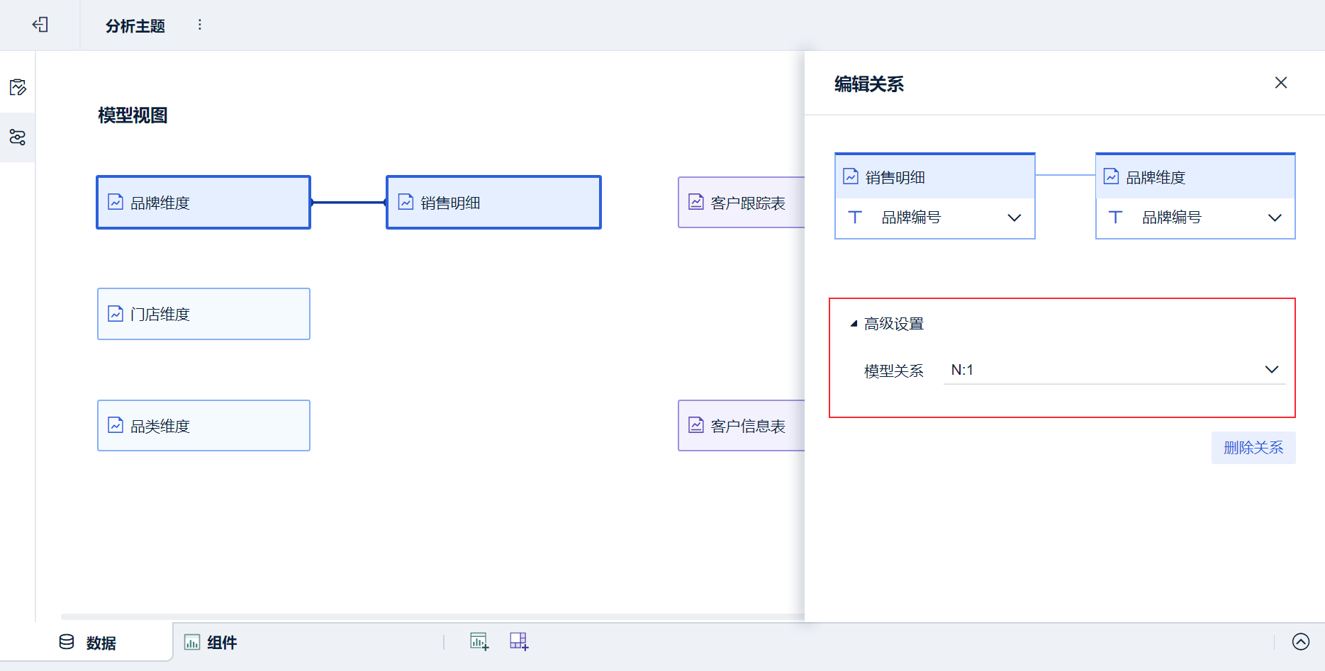 例如:「品牌维度」与「销售明细」中都有「品牌编号」字段,我们对这两张表建立一个模型关系。
